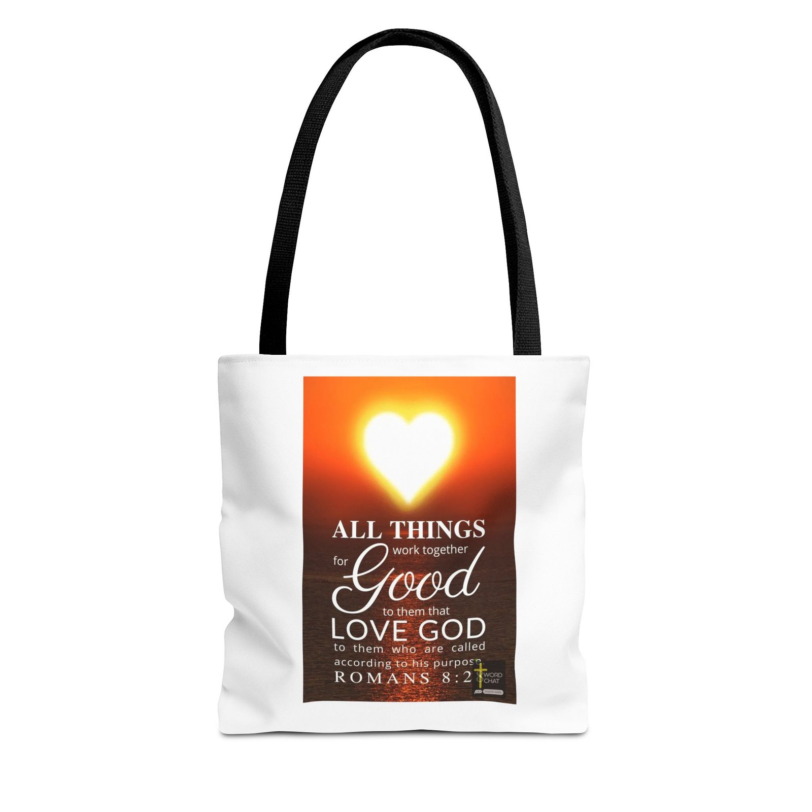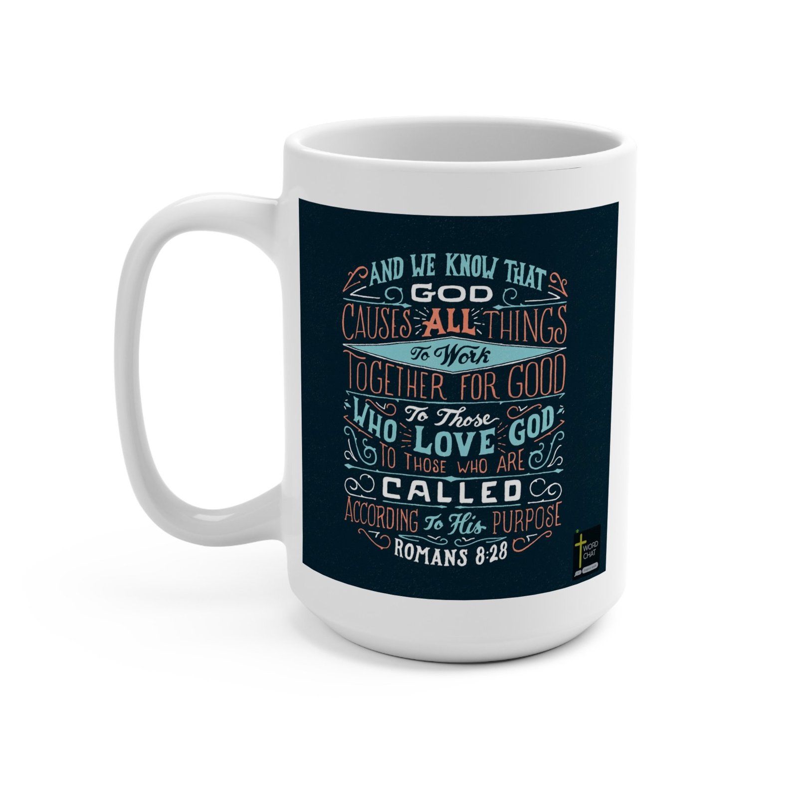 This image features a beautifully hand-lettered typography design of Romans 8:28, a well-known biblical verse, set against a dark navy background. The text is artfully arranged in multiple colors – predominantly teal, coral, and white – with decorative flourishes and swirls enhancing the visual appeal of each line. The verse reads: “And we know that God causes all things to work together for good to those who love God, to those who are called according to His purpose.” The typography is stylized with varying font sizes, emphasis, and ornamental elements that create visual interest and draw the eye across the text. In the bottom right corner, there is a small “Word Chat” logo, indicating the source or creator of this typographic art piece.