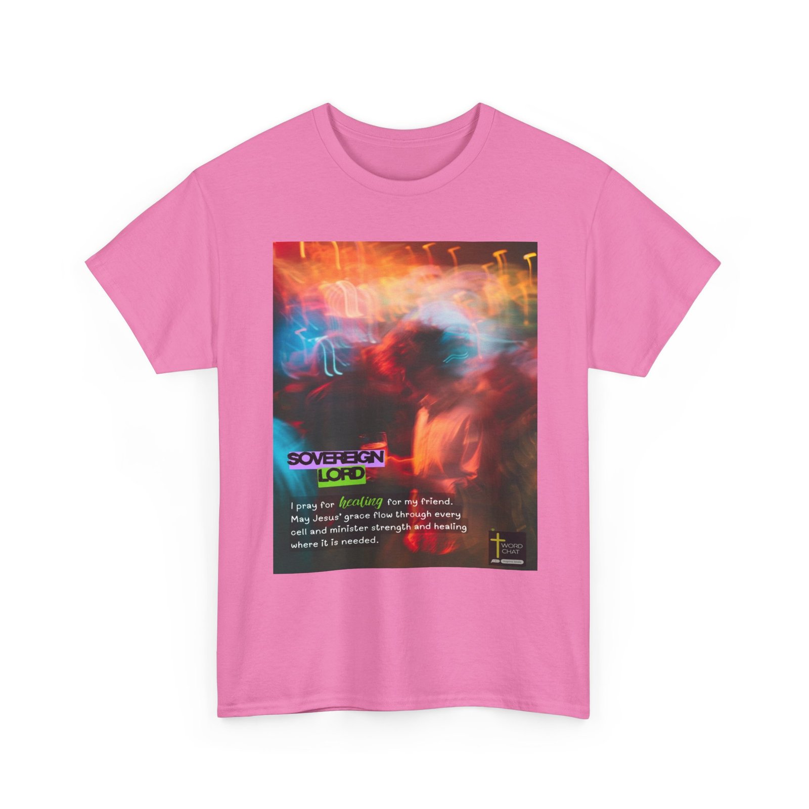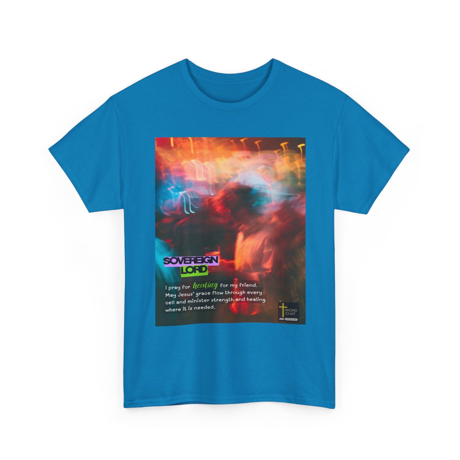 This vibrant digital artwork features a neon-lit aesthetic with abstract figures bathed in warm orange, red, and cool cyan blue light, creating a dynamic and spiritual atmosphere. The image displays bold typography with “SOVEREIGN LORD” prominently displayed in striking purple and lime green text overlaid on the composition. Below the main heading, white text presents an inspirational prayer message: “I pray for healing for my friend. May Jesus’ grace flow through every cell and minister strength and healing where it is needed.” The WordChat logo and ‘inspire souls’ tagline sit in the bottom right corner, showing the brand of this platform for finding and sharing soul stirring messages.