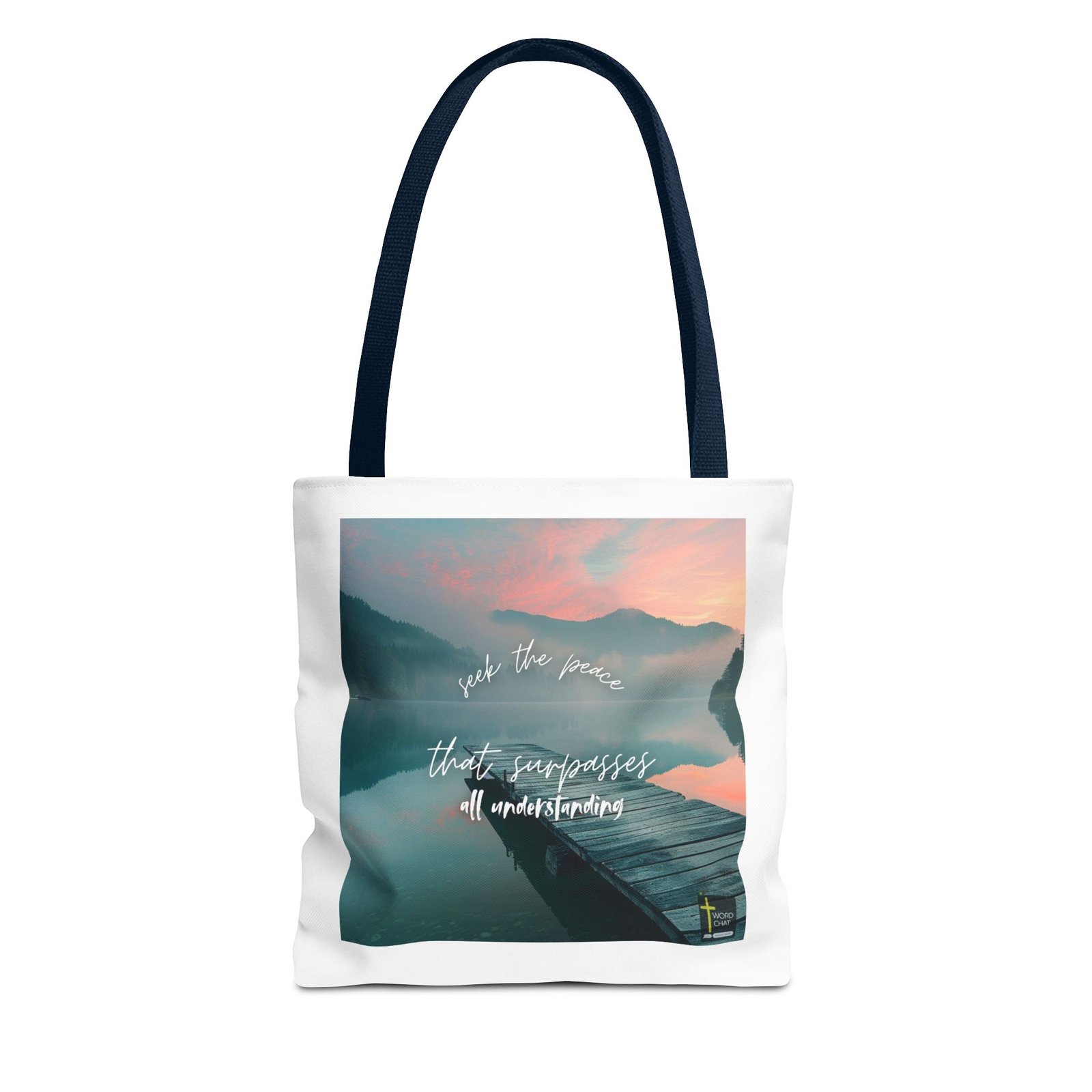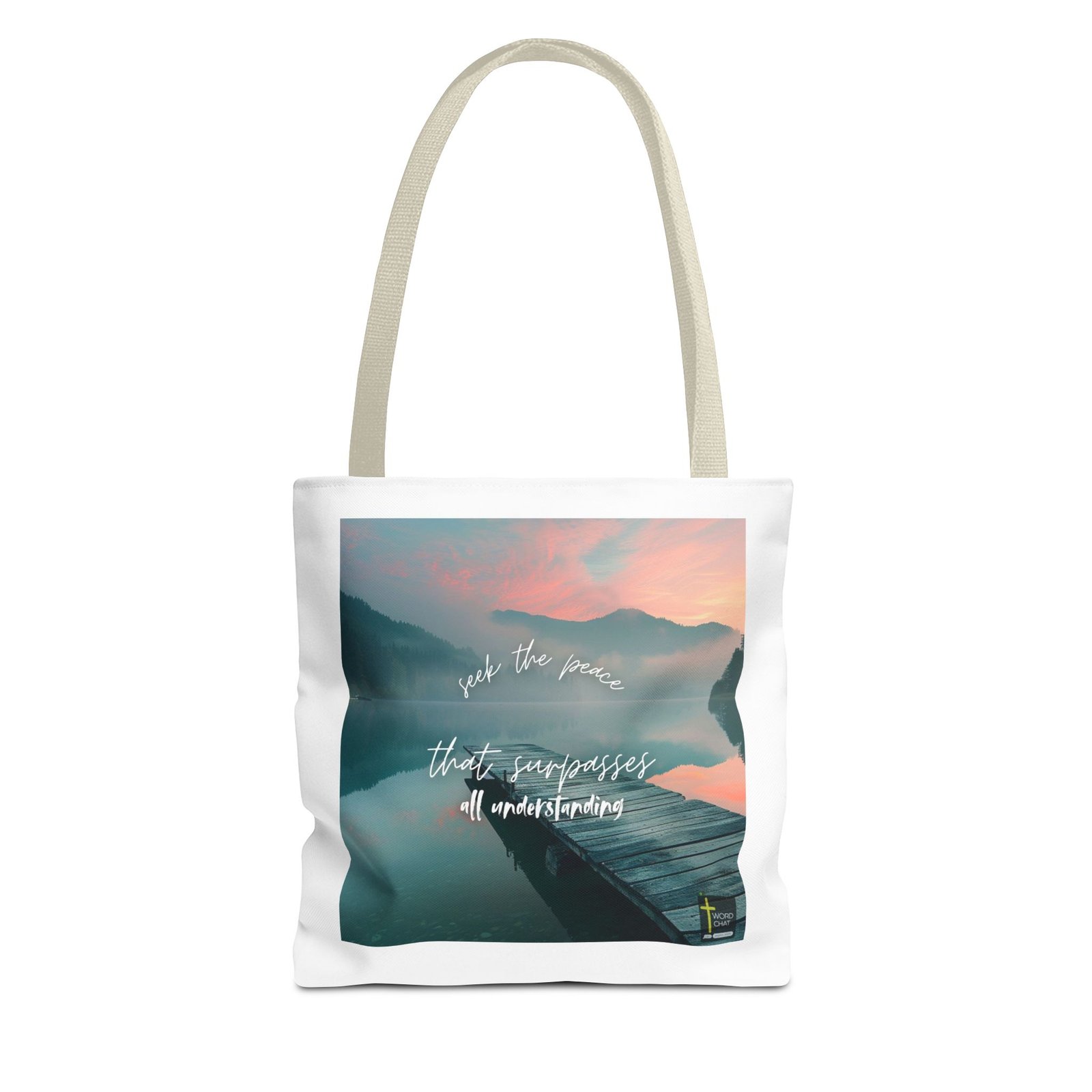 This peaceful landscape photograph features a wooden dock extending into a pristine mountain lake at sunrise or sunset, with misty forested mountains reflected in the calm water beneath a pink and orange sky. The image displays inspirational typography in elegant white cursive text reading “seek the peace that surpasses all understanding,” centered over the tranquil scene. The aesthetic combines natural beauty with motivational messaging, creating a calming and spiritually uplifting composition ideal for meditation and wellness content. A small “WordChat” logo with a cross symbol appears in the bottom right corner. The soft, dreamy color palette of blues, greens, and warm sunset tones enhances the meditative quality and contemplative mood of this nature-inspired motivational graphic.