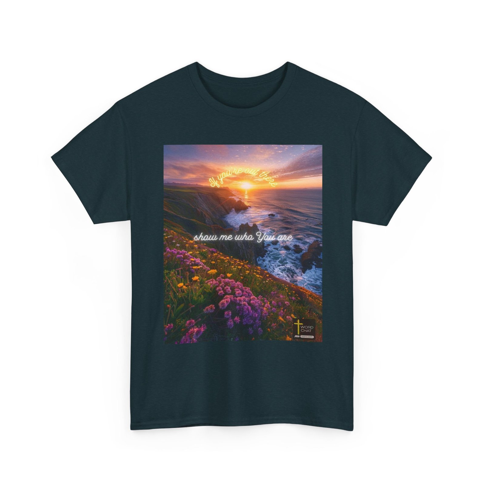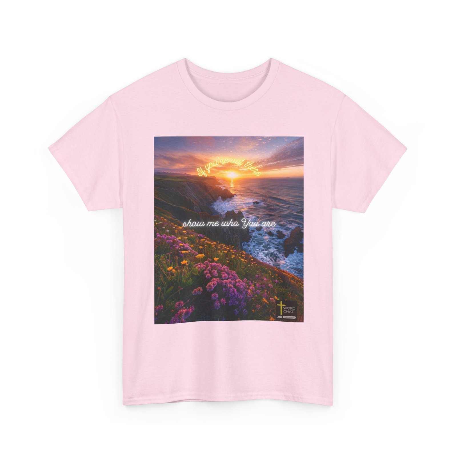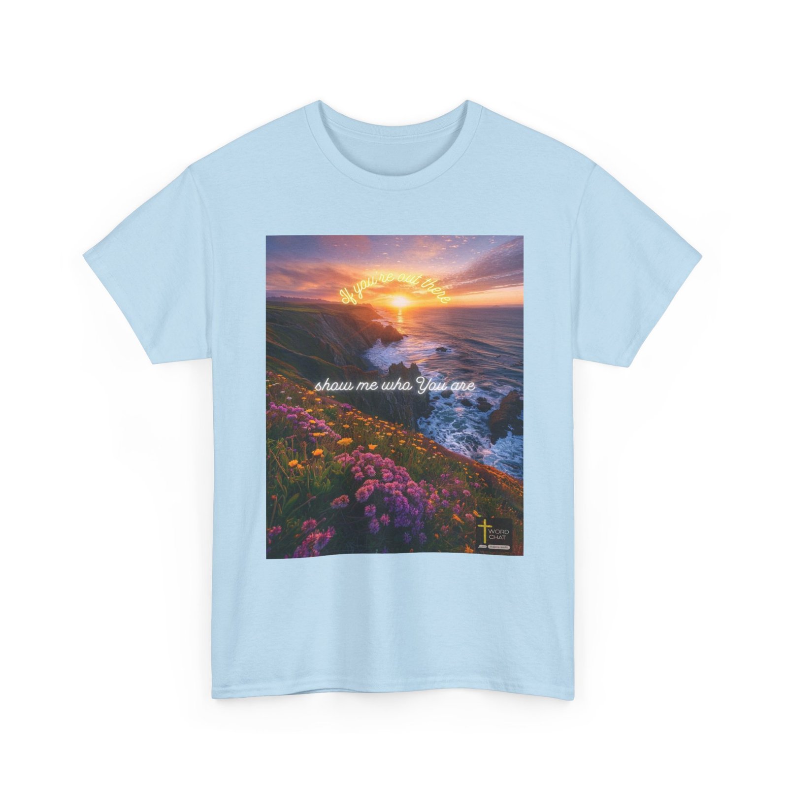 This breathtaking landscape photograph captures a dramatic clifftop vista at golden hour, featuring vibrant purple and golden wildflowers blooming across the foreground against rugged coastal cliffs. The composition showcases a serene ocean with crashing waves below jagged rock formations, while a luminous sunset creates a warm amber glow across the sky and water. Neon-style text overlays reading “If you’re out there” and “show me who you are” add an inspirational, motivational tone to the scenic imagery. The WordChat logo and ‘inspire souls’ tagline sit in the bottom right corner, showing the brand of this platform for finding and sharing soul stirring messages. The artistic style blends photorealistic landscape photography with contemporary typography design, creating an uplifting visual meant to inspire and resonate with viewers seeking spiritual or motivational content.