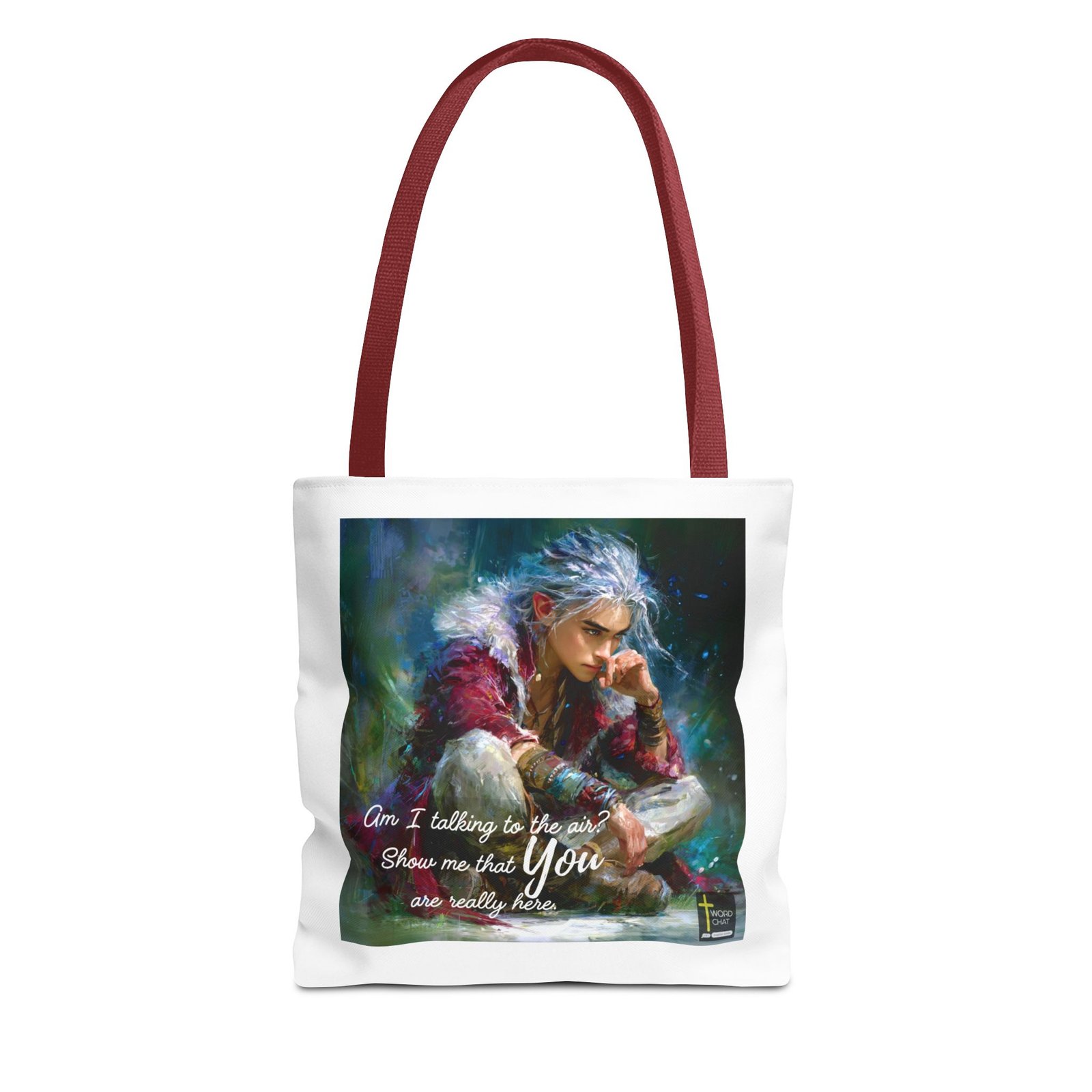This stunning digital painting depicts a contemplative figure with striking silver-white hair and red-tipped ears, dressed in a vibrant burgundy and gold ornate jacket. The character is posed in a thoughtful prayer position with their hand near their face, set against an ethereal background of swirling blues, greens, and purple brushstrokes. Overlaid on the image is inspirational scripture text reading “Am I talking to the air? Show me that you are really here,” rendered in elegant white cursive font. The artistic style blends fantasy character design with painterly digital illustration techniques, creating a dreamy, spiritual atmosphere enhanced by bokeh light effects and flowing color gradients. The WordChat logo and ‘inspire souls’ tagline sit in the bottom right corner, showing the brand of this platform for finding and sharing soul stirring messages.