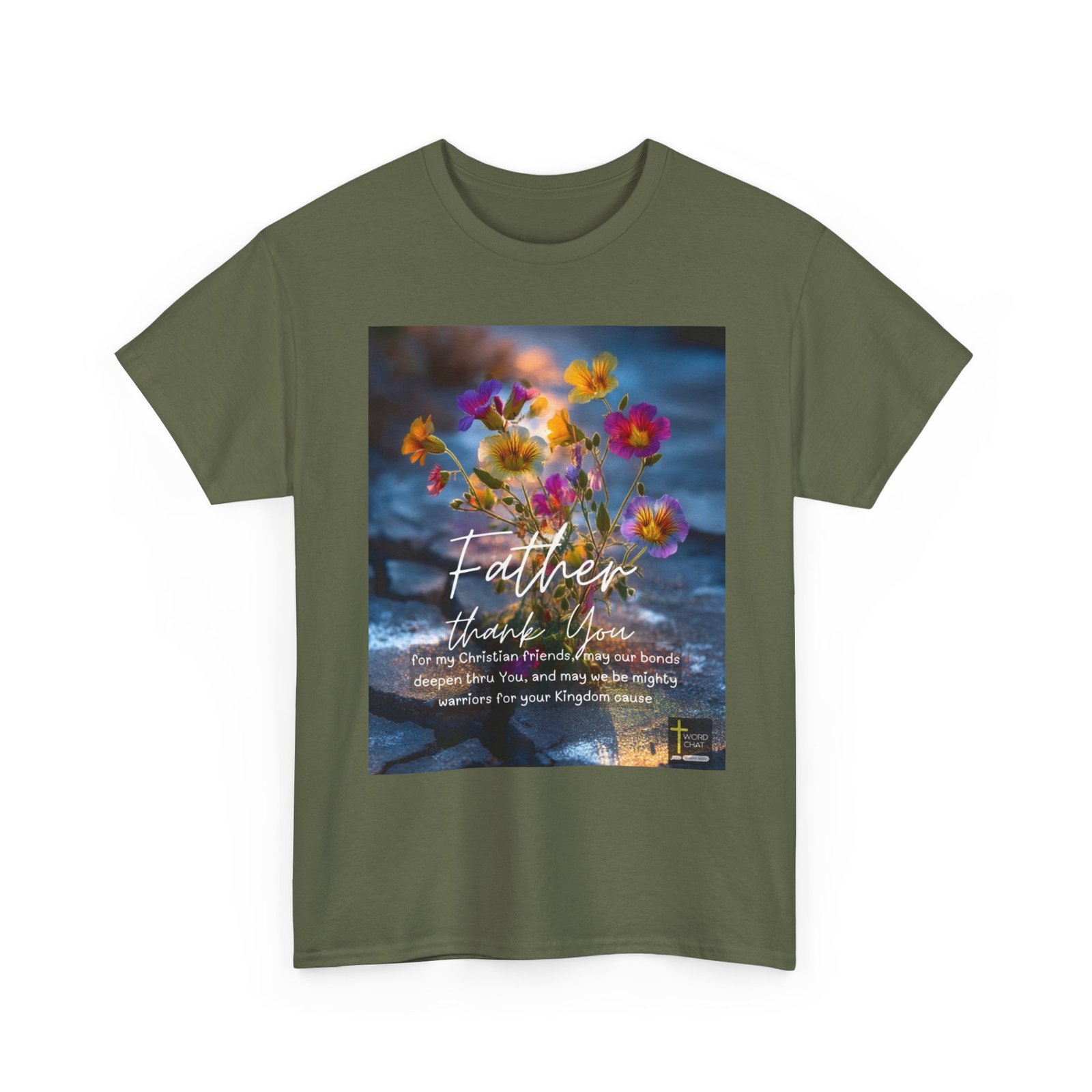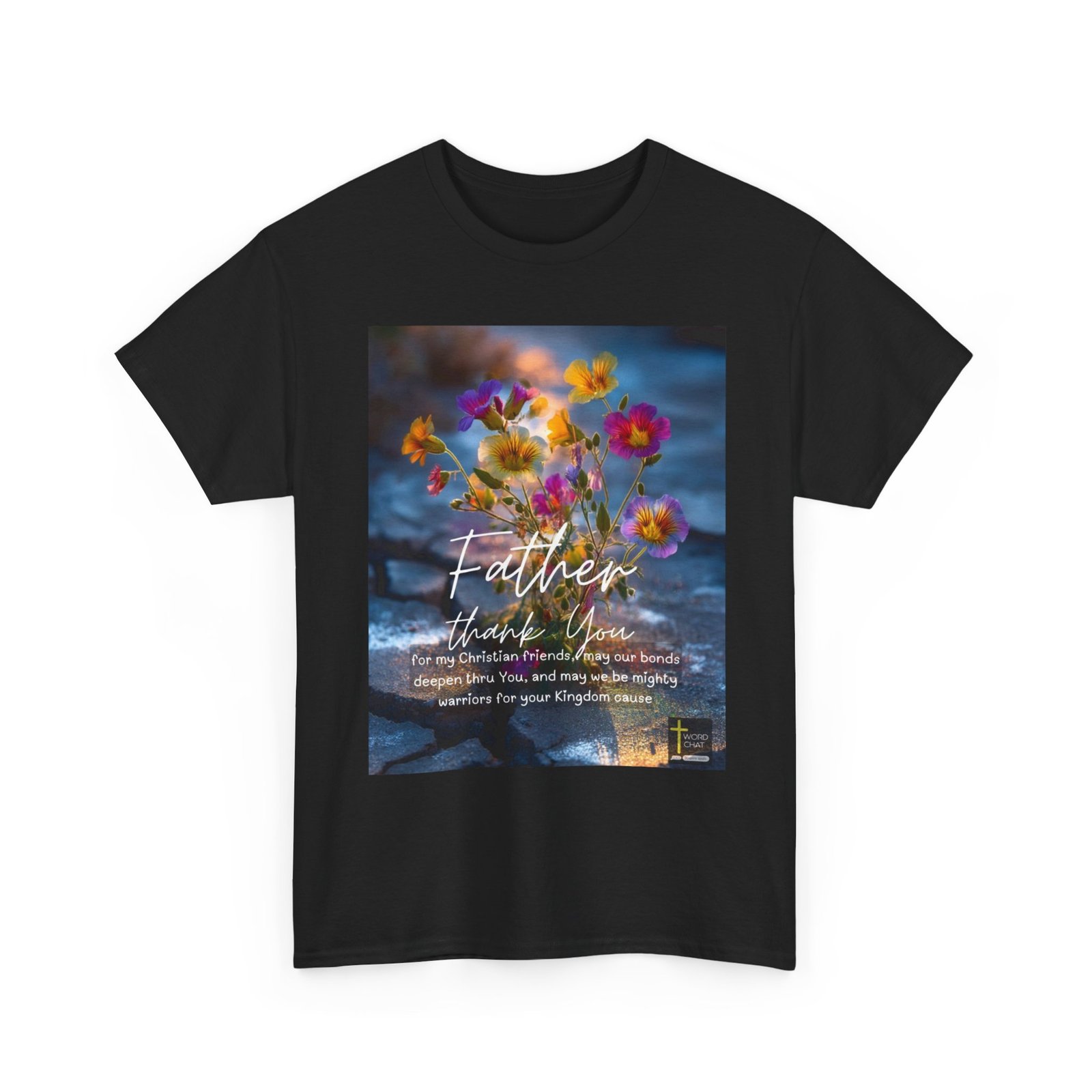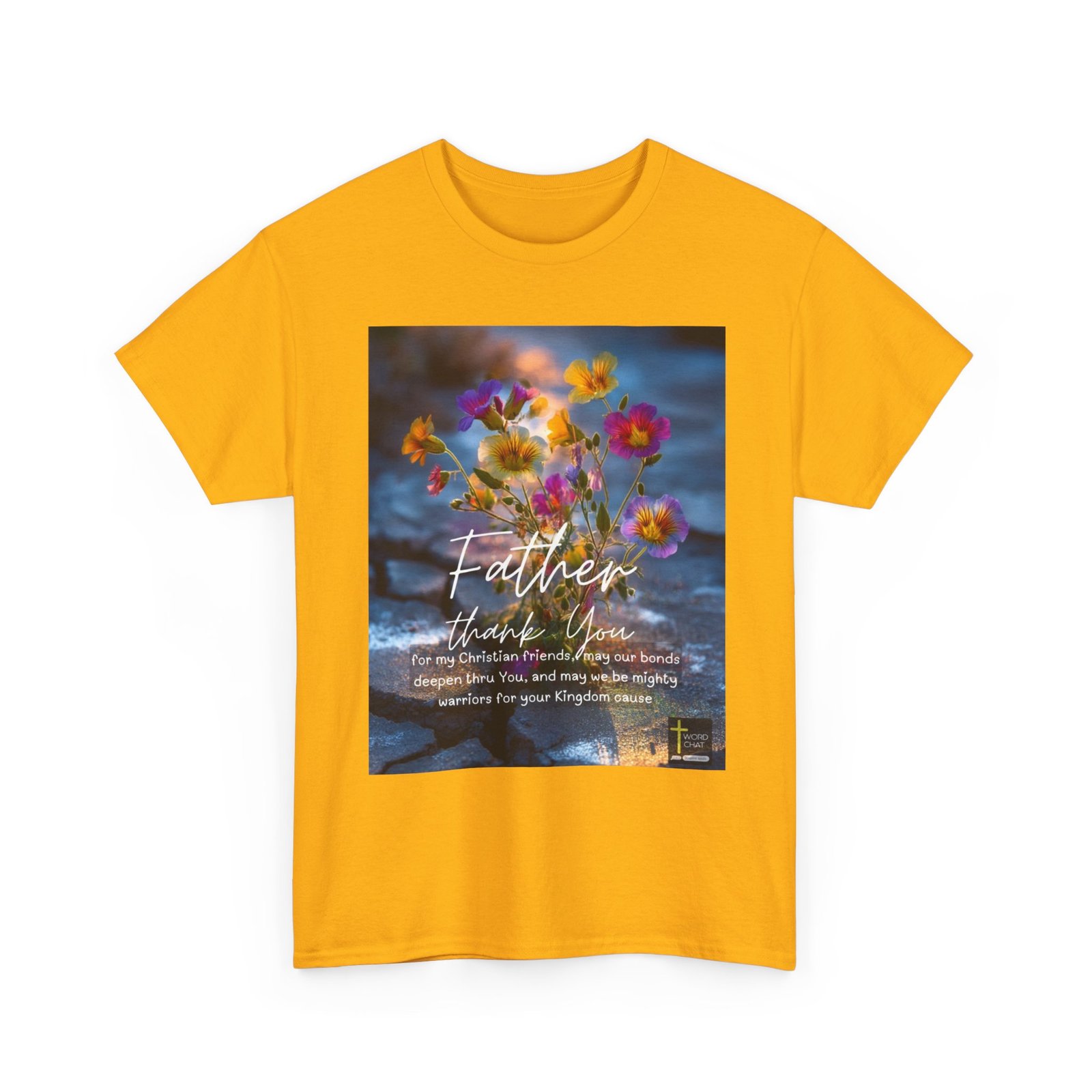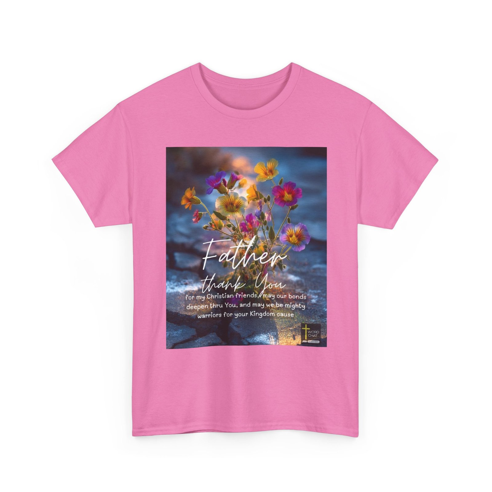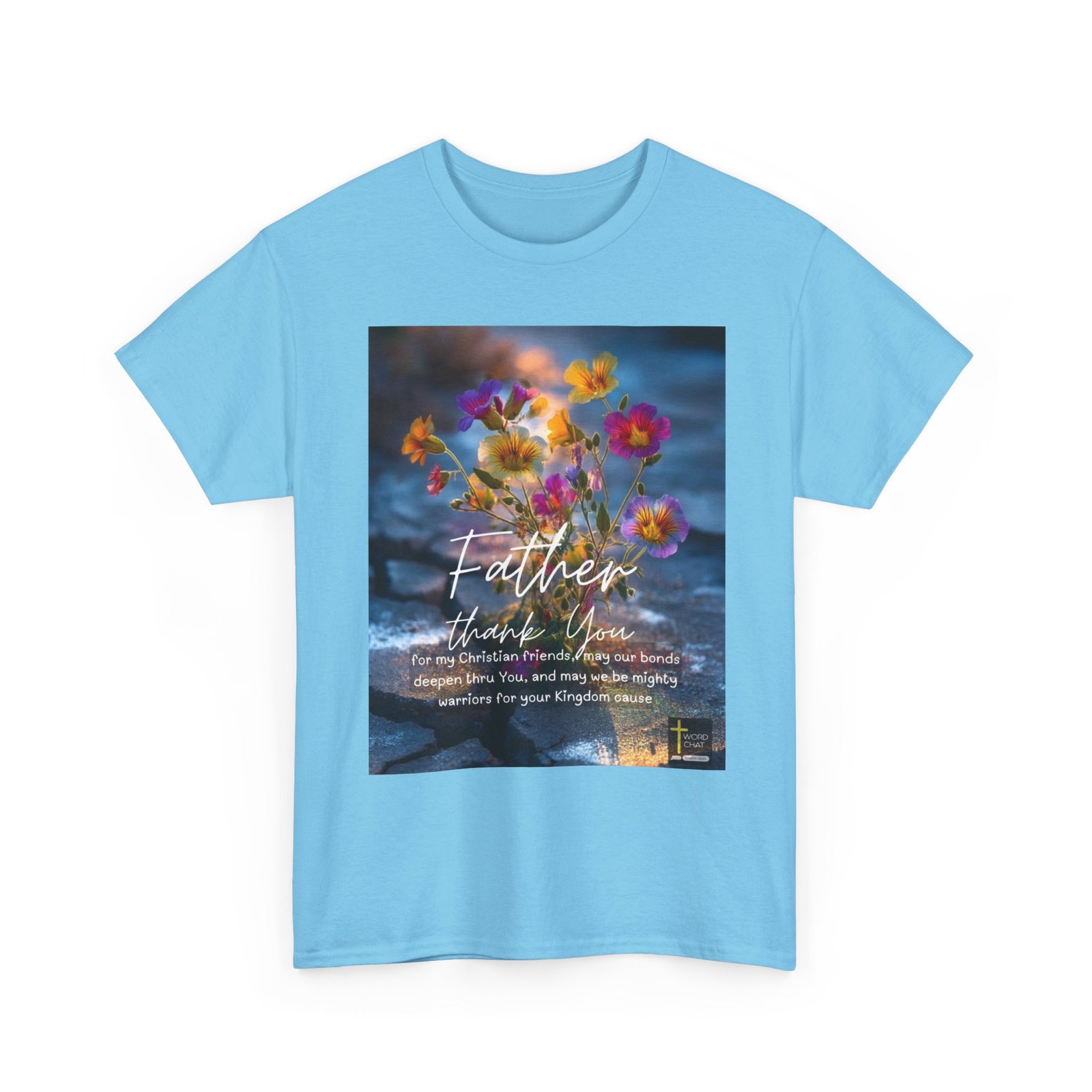 This inspirational greeting card features vibrant, multicolored flowers including yellow, pink, purple, and magenta blooms against a blurred blue and sandy background, creating an artistic bokeh effect. The image displays elegant white cursive text reading “Father thank You” overlaid on the floral scene, followed by a heartfelt Christian message about deepening bonds with friends through faith. The WordChat logo and ‘inspire souls’ tagline sit in the bottom right corner, showing the brand of this platform for finding and sharing soul stirring messages. The soft-focus background emphasizes the fresh flowers in sharp detail, evoking themes of gratitude, faith, and Christian fellowship.
