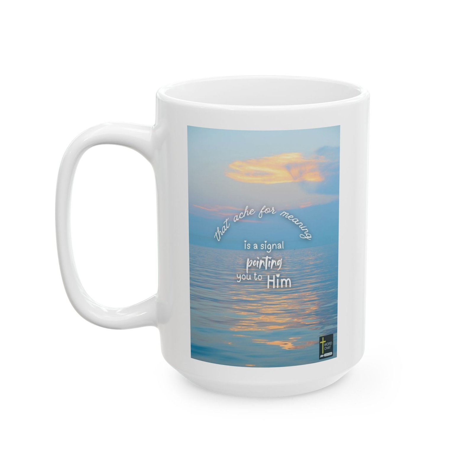 This inspiring spiritual image features a tranquil ocean landscape at sunset with golden clouds reflecting across calm blue waters, creating a peaceful and meditative atmosphere. Overlaid on the serene seascape is white script typography displaying an encouraging religious message that reads “that ache for meaning is a signal pointing you to Him.” The composition combines natural beauty with faith-based motivation, offering uplifting visual content suitable for Christian devotionals and inspirational social media posts. A WordChat logo with a cross symbol appears in the bottom right corner. The soft color palette of blues, golds, and warm tones enhances the contemplative mood while the elegant handwritten-style font adds an accessible and heartfelt quality to the spiritual affirmation.