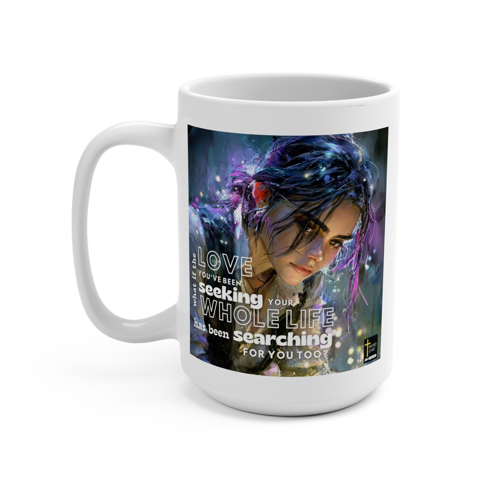 This stunning digital artwork features a futuristic portrait of a woman with flowing, windswept hair adorned with vibrant neon accents in shades of purple, blue, and magenta. The character’s face displays realistic human features with striking eyes and delicate facial details, blending seamlessly with cyberpunk-inspired technological elements that glow with ethereal light particles. Overlaid on the image is an inspirational quote in bold white text reading “what if the LOVE you’ve been seeking your WHOLE LIFE has been searching FOR YOU TOO?” The background features a dreamy, atmospheric blur of soft blues and purples with glowing orbs and light effects that create a mystical, digital ambiance. The image includes a “WORDCHAT” logo with a cross symbol in the bottom right corner.