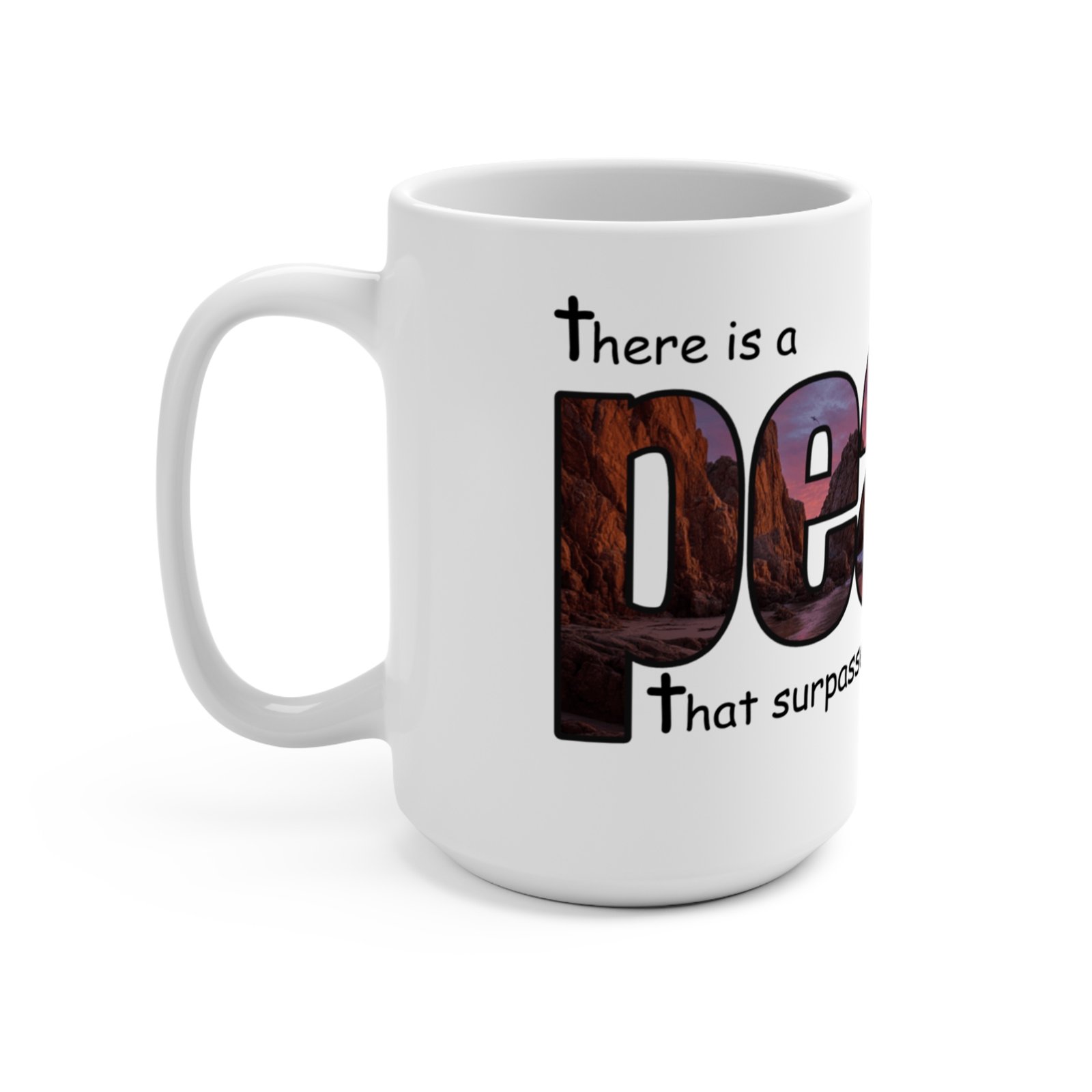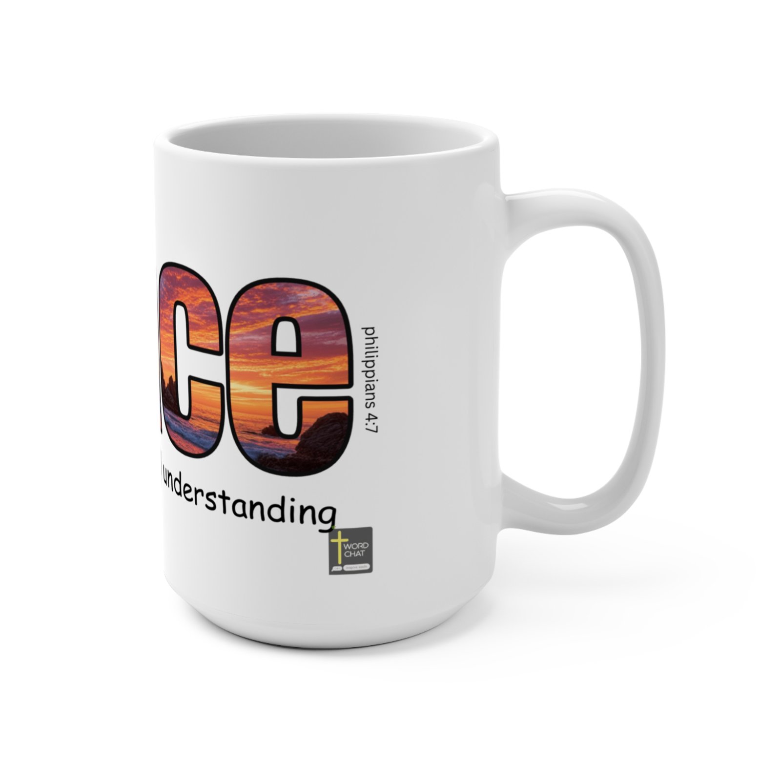This inspirational graphic features the word “peace” composed of large letters filled with scenic landscape photography depicting coastal rock formations and ocean vistas. The text “There is a” appears above the main word, while “That surpasses all understanding” is positioned below, creating a complete biblical message referencing Philippians 4:7. Each letter of “peace” contains a different photographic view of natural seascapes with dramatic cliffs and water scenes. A vertical text element reading “Philippians 4:7” is integrated along the right edge of the composition. The image includes a small WordChat logo in the lower right corner.