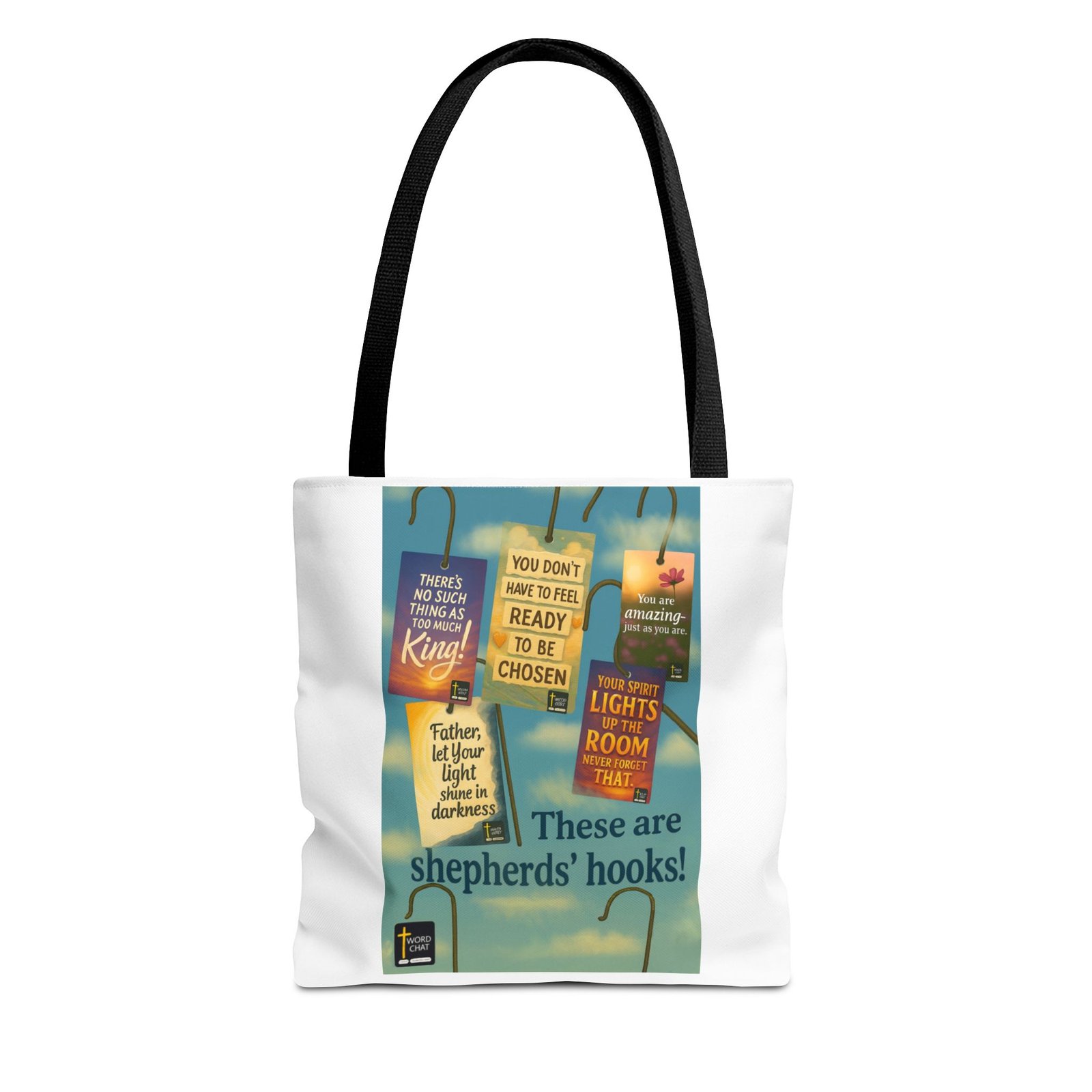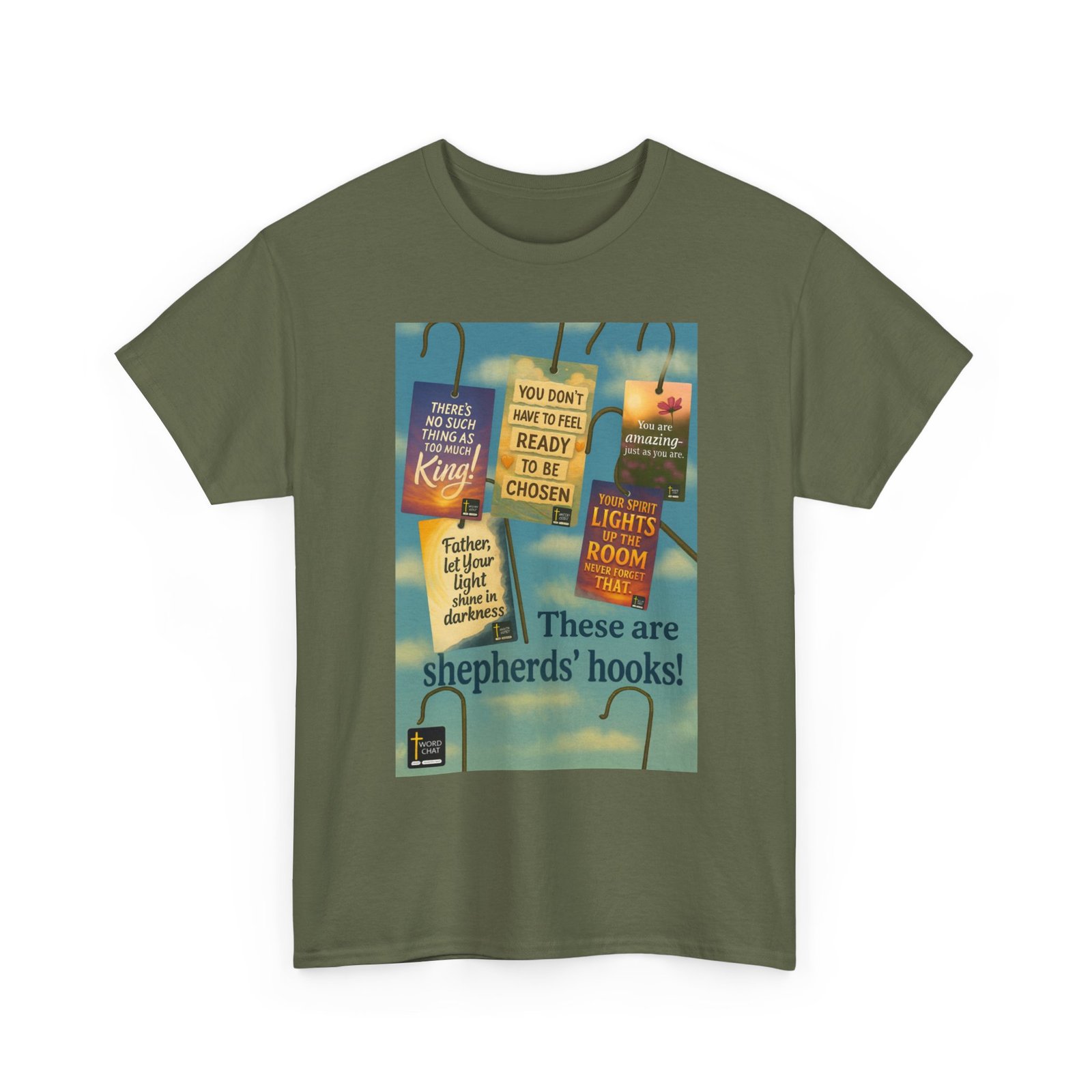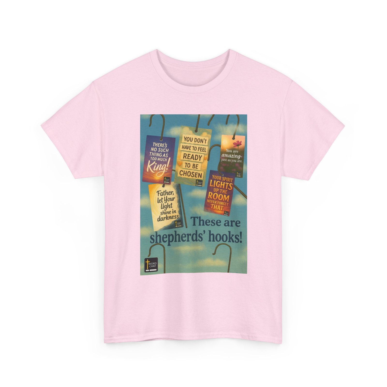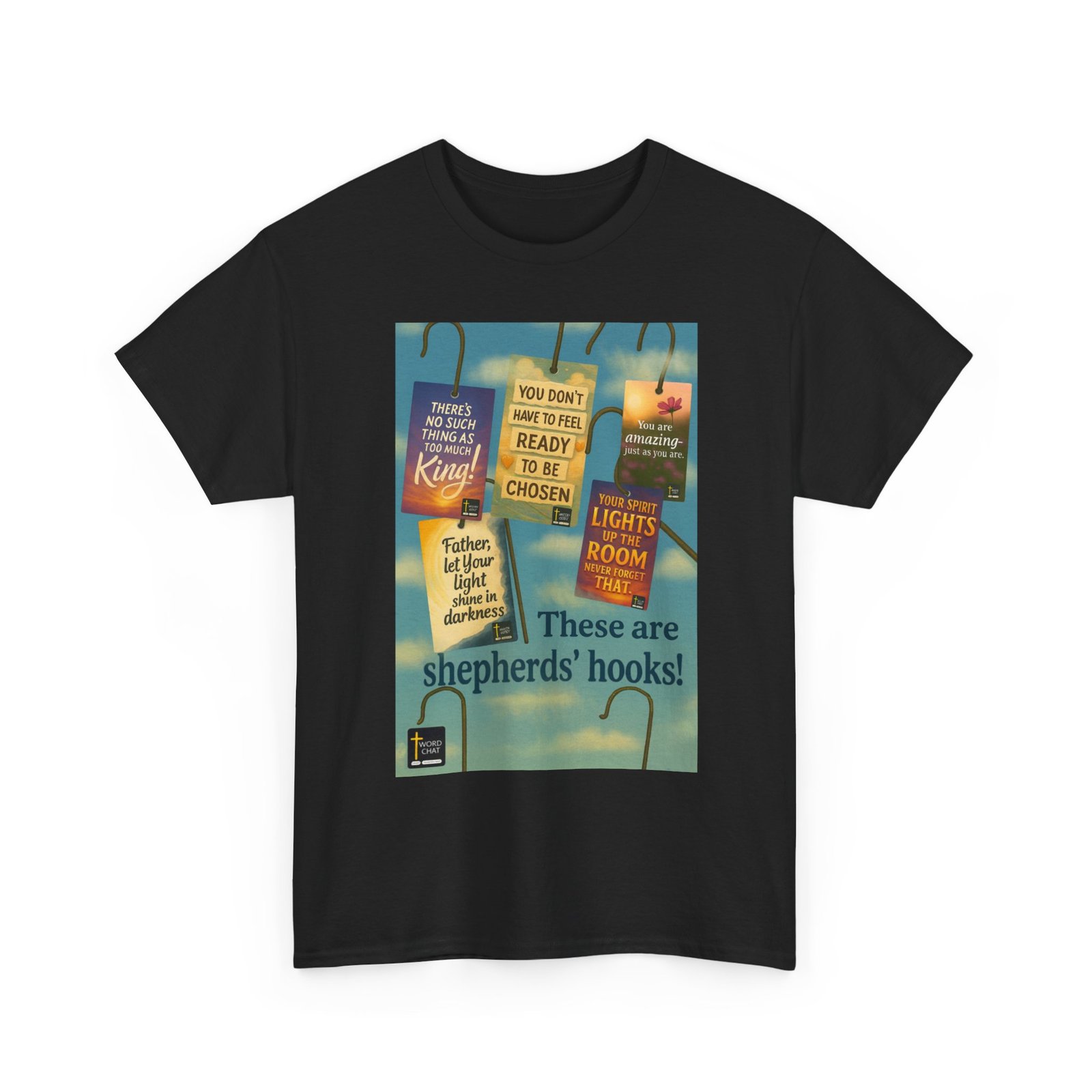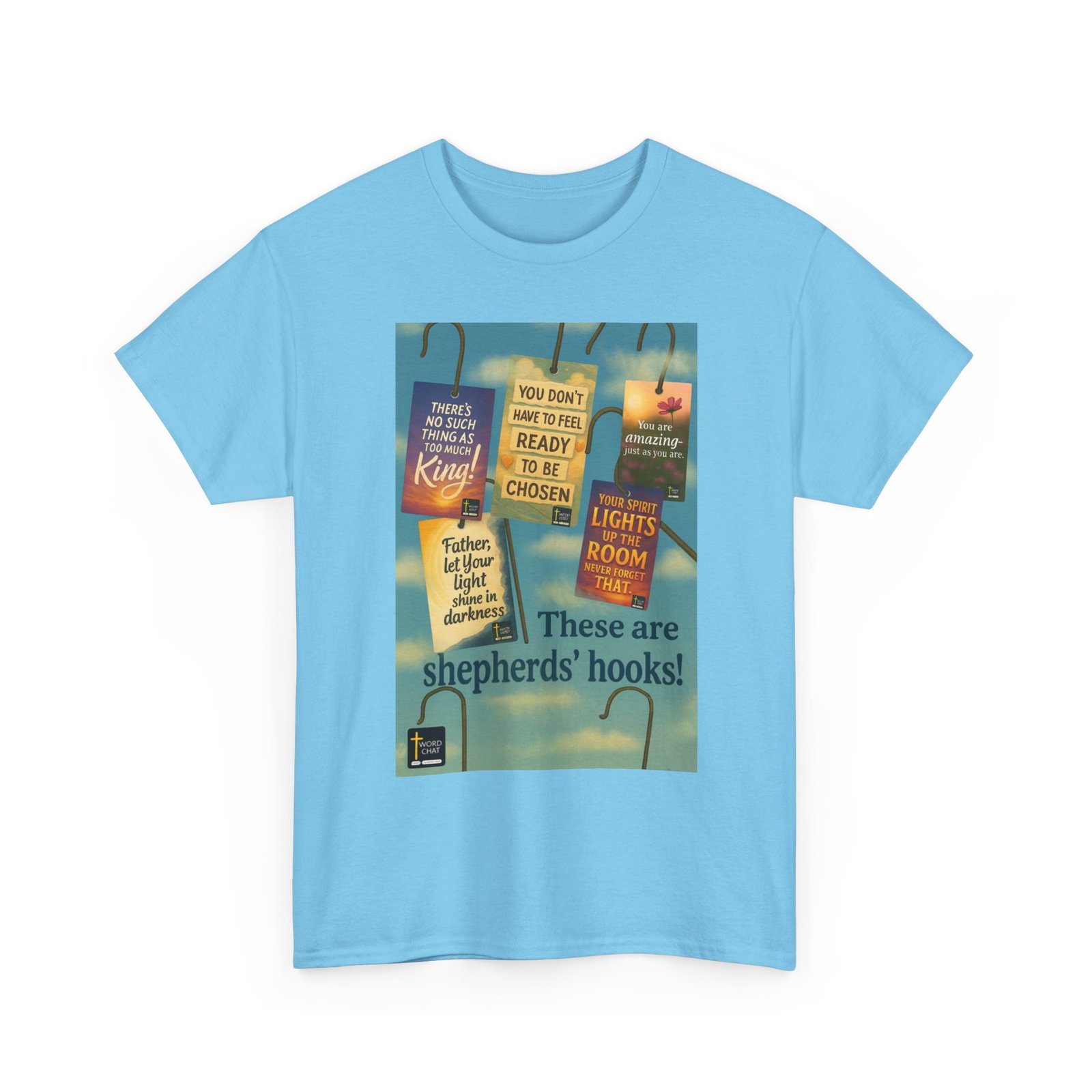 “These are shepherds’ hooks!” This inspirational image displays old timey shepherd’s hooks adorned with hanging tags featuring uplifting WordChat messages. Each tag, rendered in vibrant colors including sunset orange, sky blue, and soft yellow, displays affirming statements such as “There’s no such thing as too much King!”, “You don’t have to feel ready to be chosen,” and “Your spirit lights up the room never forget that.” The background showcases a serene blue sky with white clouds, creating a peaceful and hopeful atmosphere that complements the motivational messages. The bottom includes the WordChat logo. Use these hooks to start conversations of eternal signficance!!!