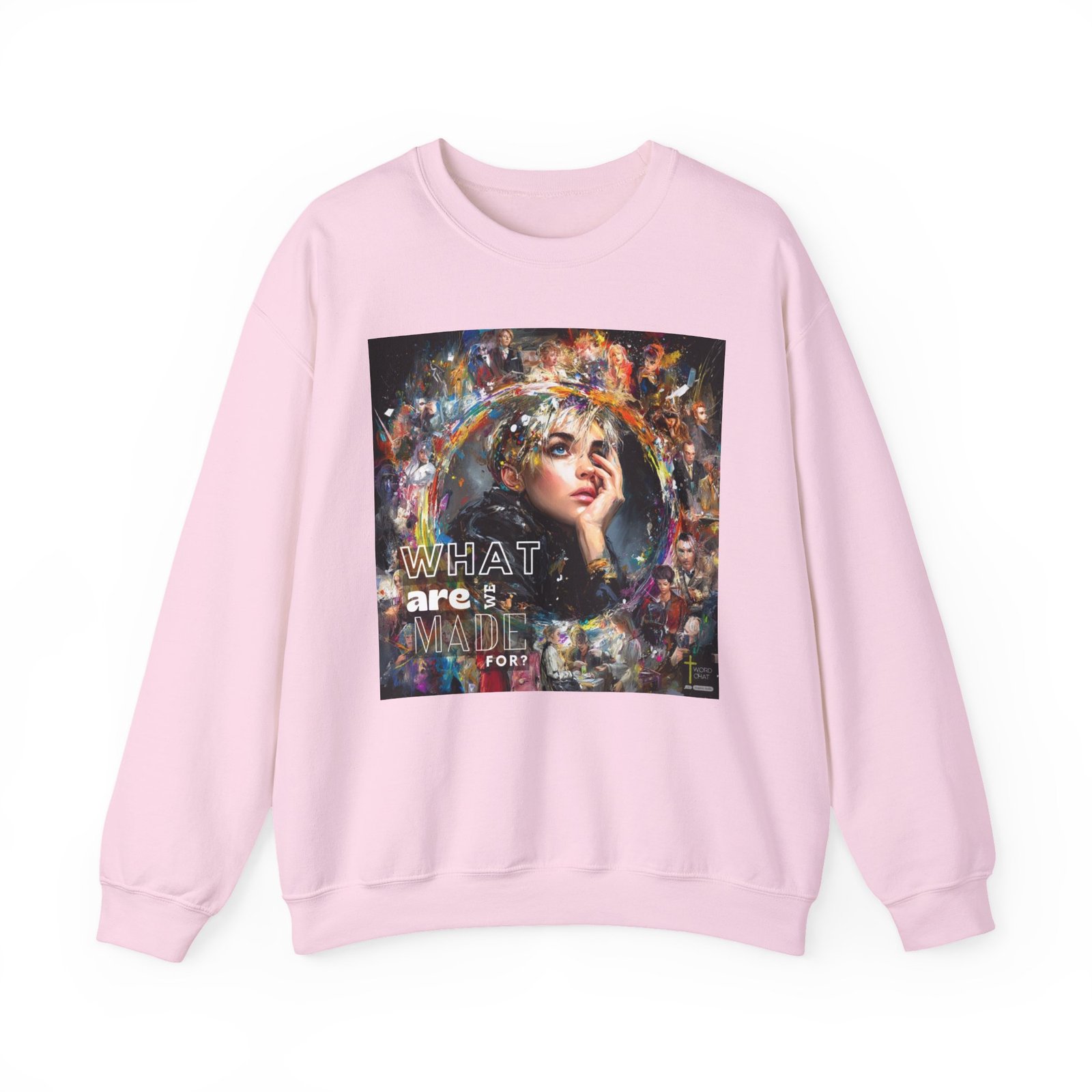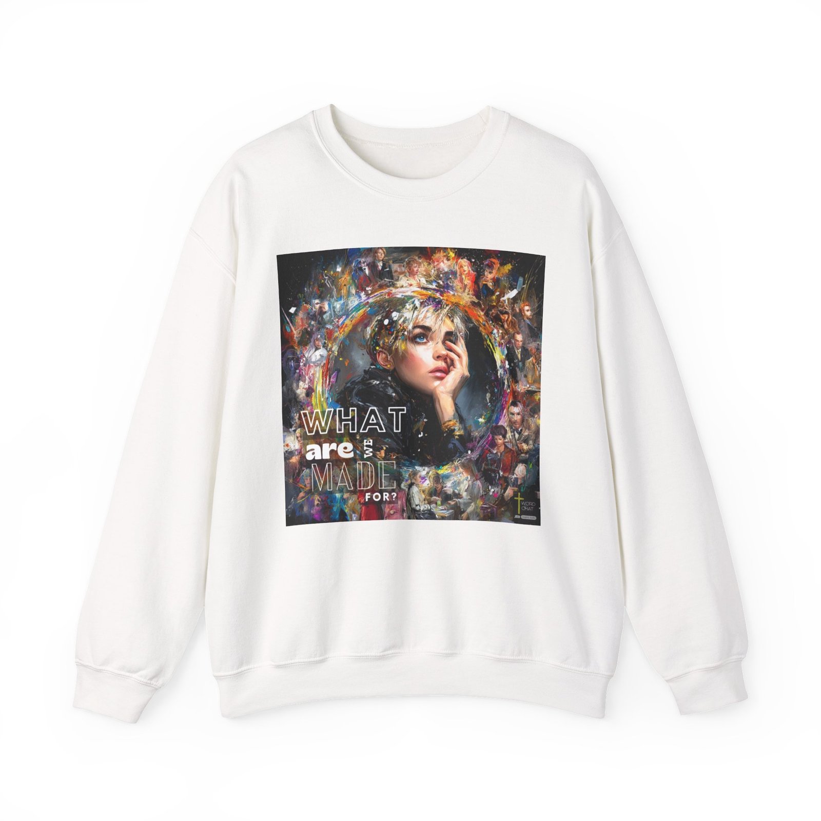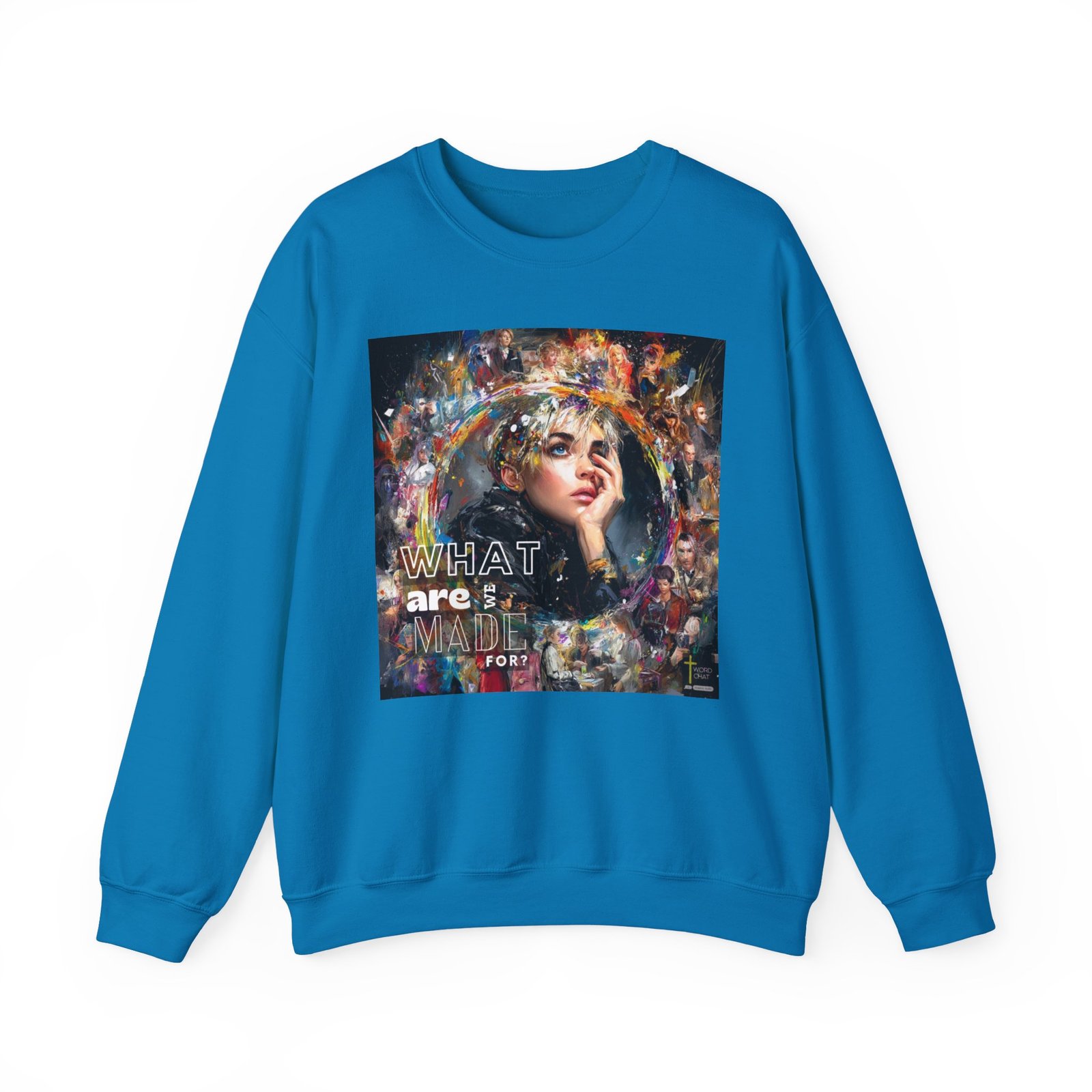 This vibrant abstract artwork features a contemplative young woman with platinum blonde hair as the central focal point, her face rendered in realistic detail against an explosive backdrop of colorful paint splatters and dynamic brushstrokes in blues, yellows, purples, and reds. Surrounding the main figure is a collage of smaller portrait faces and figures, creating a layered composition that suggests themes of identity, influence, and interconnectedness. The piece combines mixed-media elements including photorealistic portraiture, abstract expressionism, and digital art techniques, with bold text overlaid reading “WHAT are MADE FOR?” and a “WORDCHAT” logo in the bottom corner. The overall aesthetic blends contemporary pop art with fine art sensibilities, using vibrant color contrasts and energetic paint gestures to create visual movement and emotional impact. This striking composition appears designed as motivational or philosophical digital artwork, suitable for social media engagement and contemporary art appreciation.