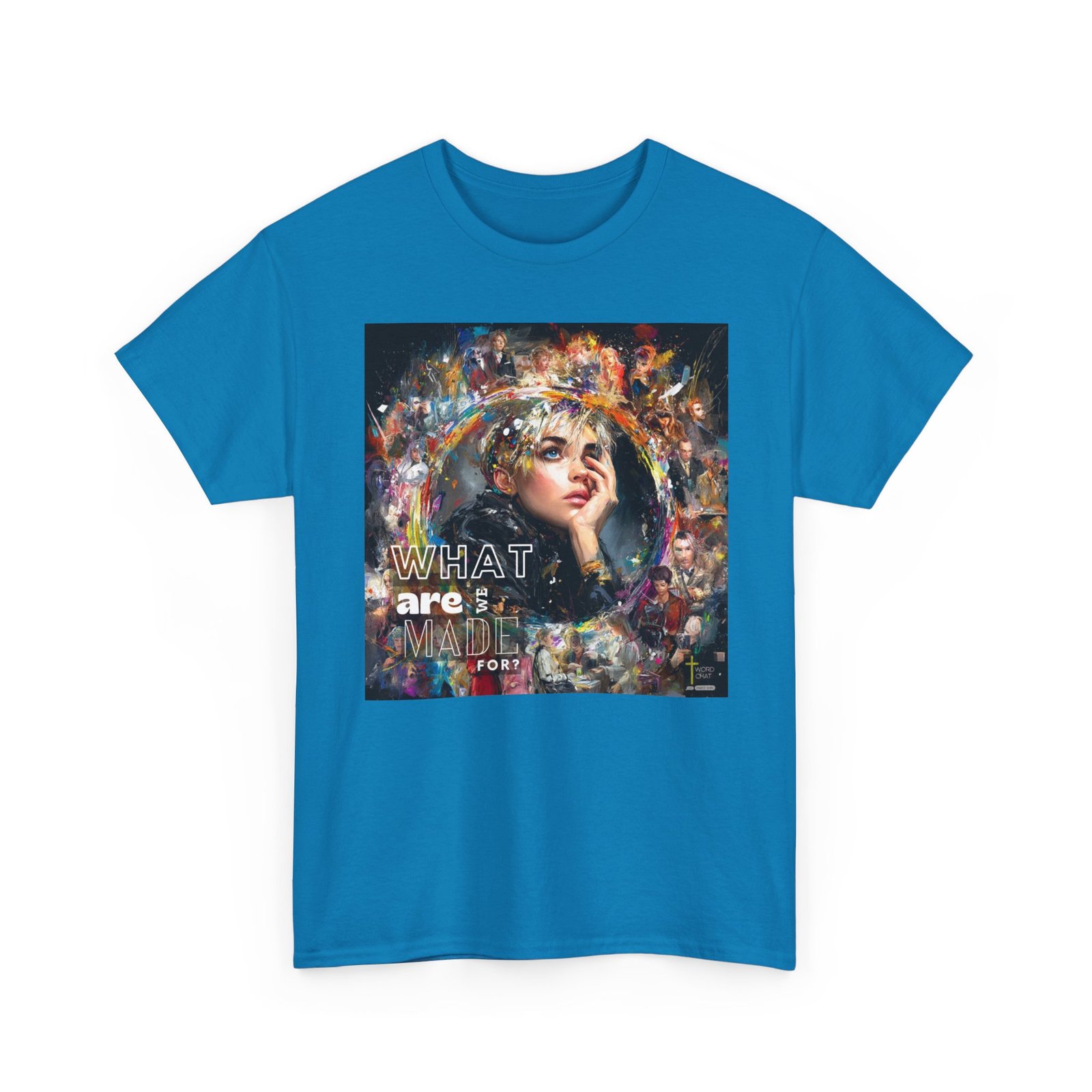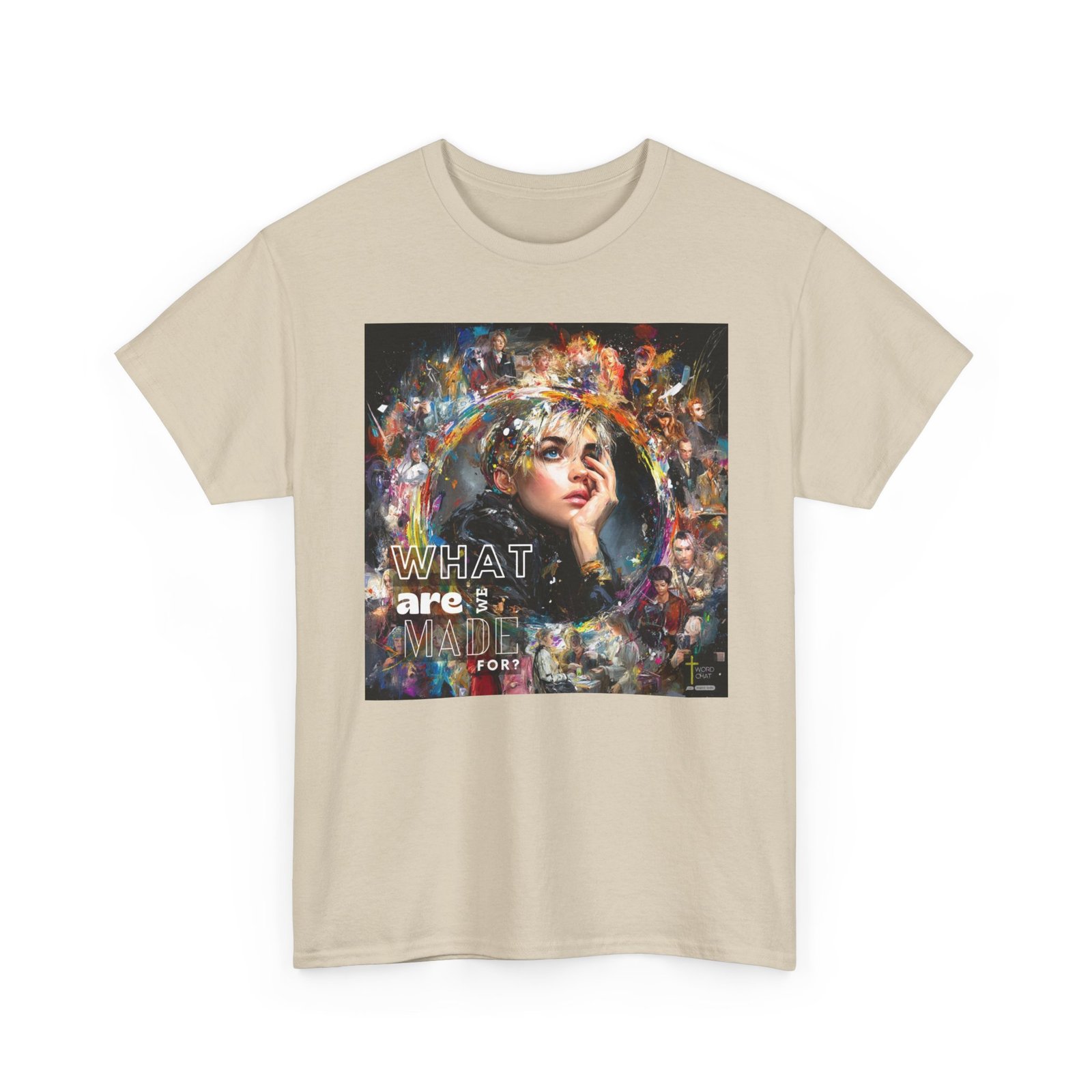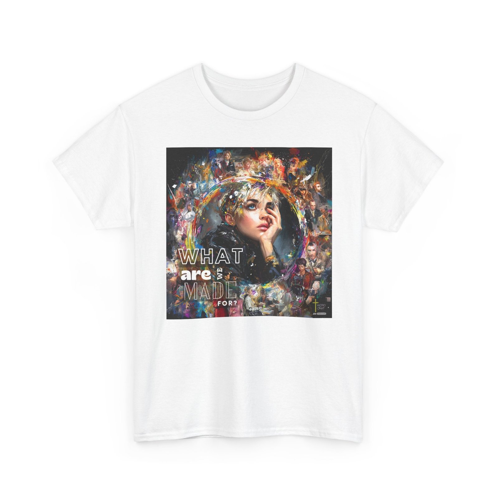 This vibrant mixed-media artwork features a close-up portrait of a contemplative young woman with short blonde hair as the central focal point, surrounded by a dynamic collage of additional figures and colorful abstract paint splashes. The composition employs an expressive artistic style combining realistic portraiture with bold, multicolored brushstrokes and paint splatters in yellows, blues, purples, and reds that radiate outward from the main subject. Multiple secondary figures are layered throughout the background, creating depth and visual interest through varying levels of detail and opacity. Bold white text reading “WHAT are MADE FOR?” is prominently overlaid on the left side of the composition, while a “WORDCHAT” logo with a cross symbol appears in the bottom right corner. The overall aesthetic merges contemporary digital art with painterly techniques, creating an emotionally evocative piece that explores themes of identity and purpose through its visually striking, energetic design.