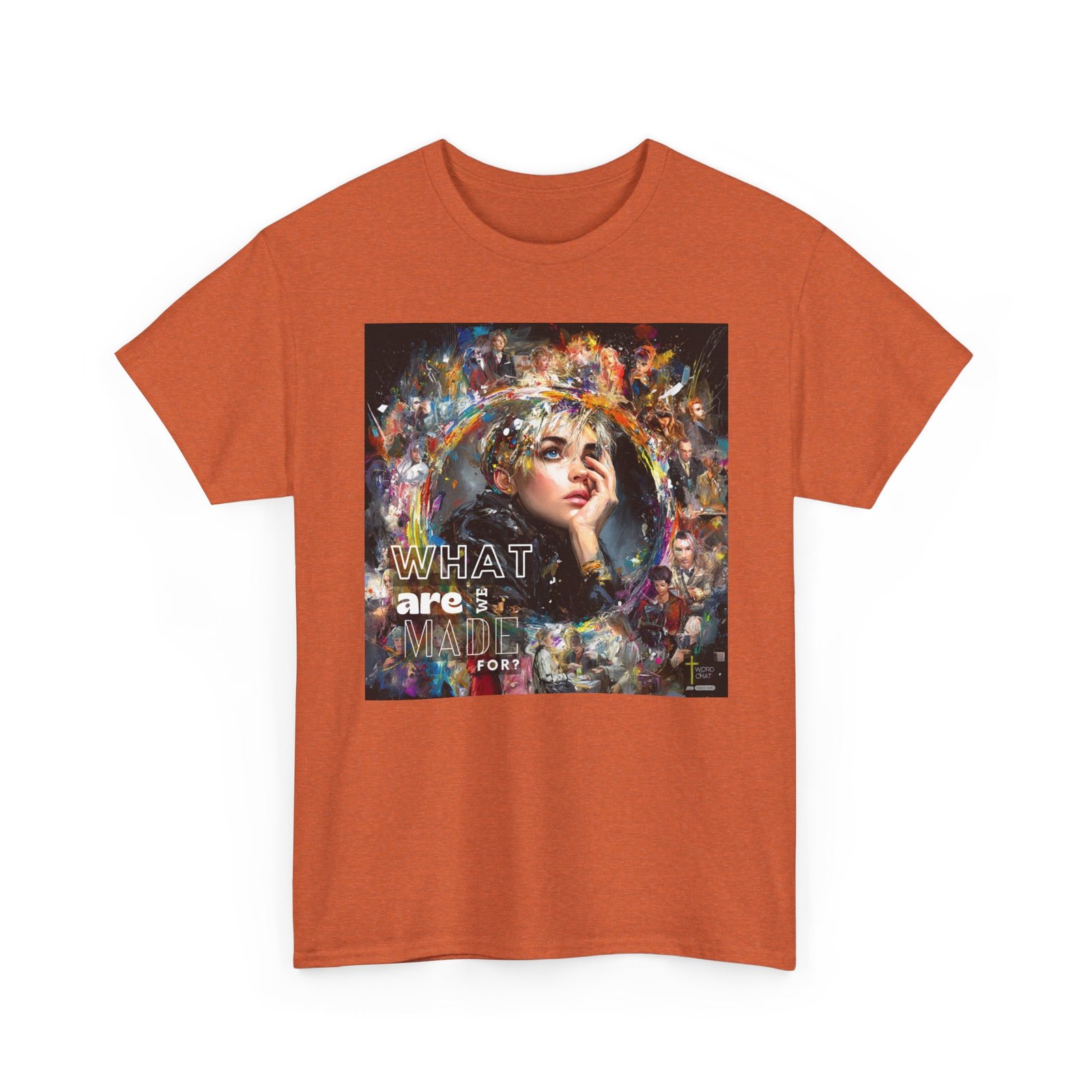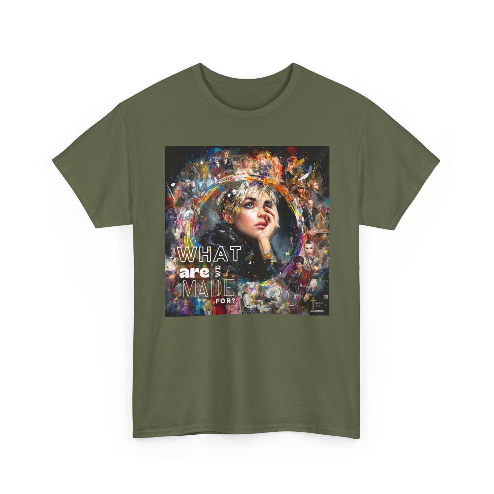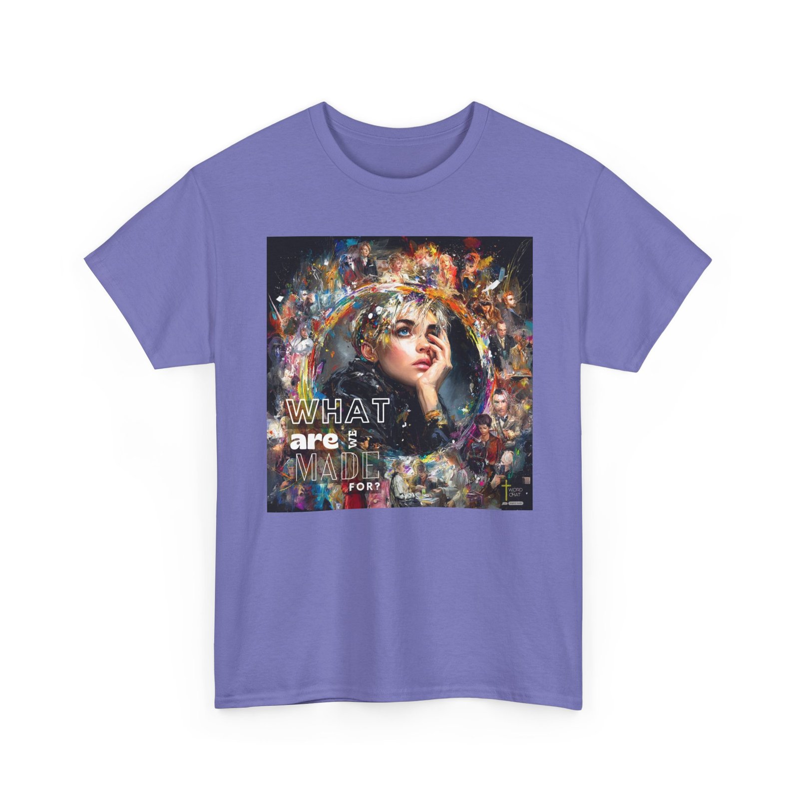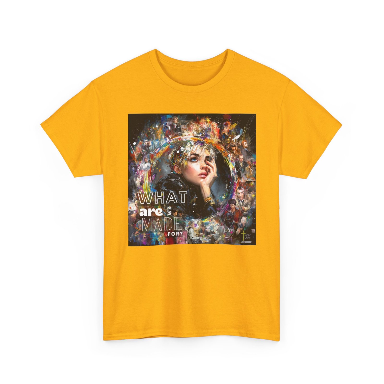 This vibrant mixed-media artwork features a close-up portrait of a contemplative young woman with short blonde hair as the central focal point, surrounded by a dynamic collage of additional figures and colorful abstract paint splashes. The composition employs an expressive artistic style combining realistic portraiture with bold, multicolored brushstrokes and paint splatters in yellows, blues, purples, and reds that radiate outward from the main subject. Multiple secondary figures are layered throughout the background, creating depth and visual interest through varying levels of detail and opacity. Bold white text reading “WHAT are MADE FOR?” is prominently overlaid on the left side of the composition, while a “WORDCHAT” logo with a cross symbol appears in the bottom right corner. The overall aesthetic merges contemporary digital art with painterly techniques, creating an emotionally evocative piece that explores themes of identity and purpose through its visually striking, energetic design.