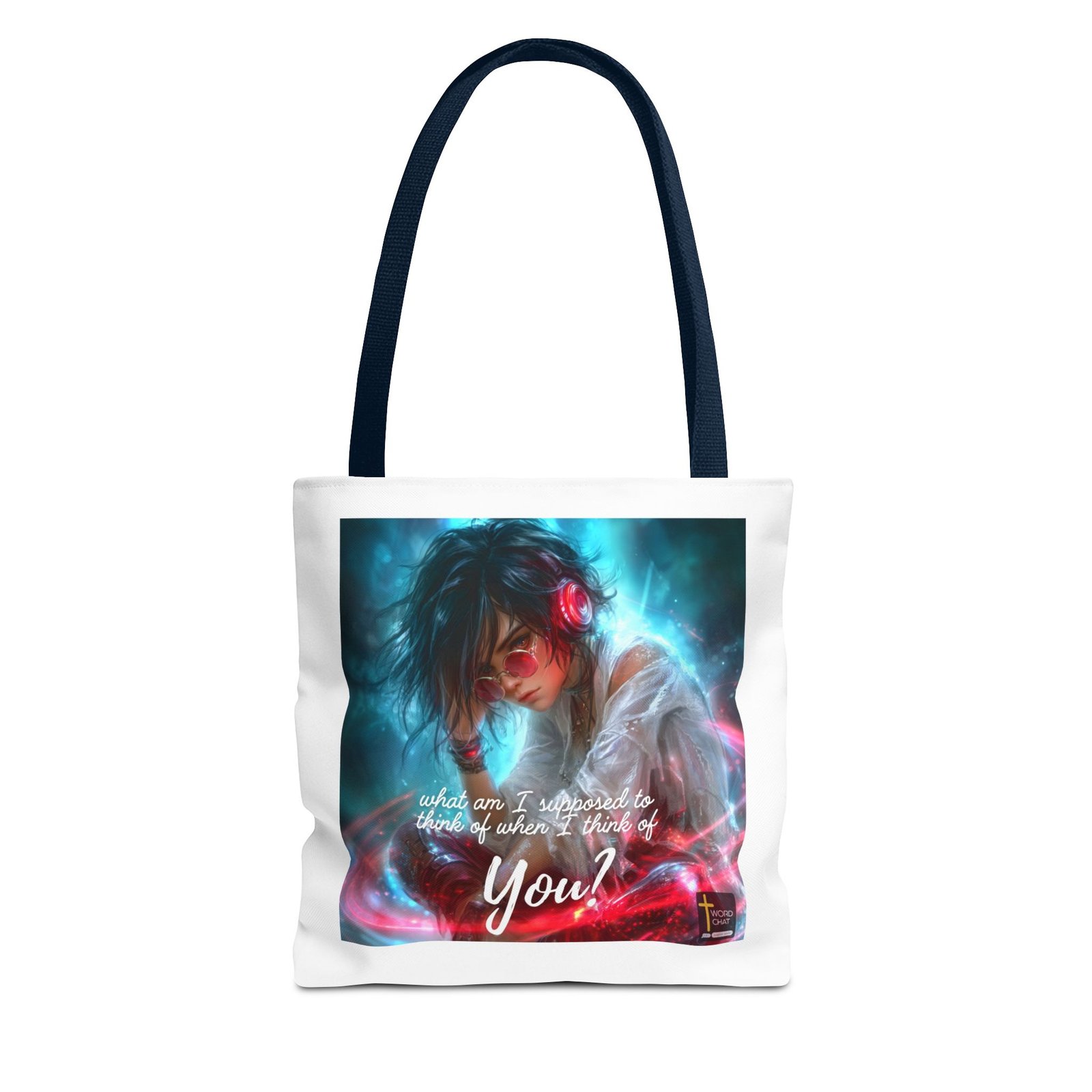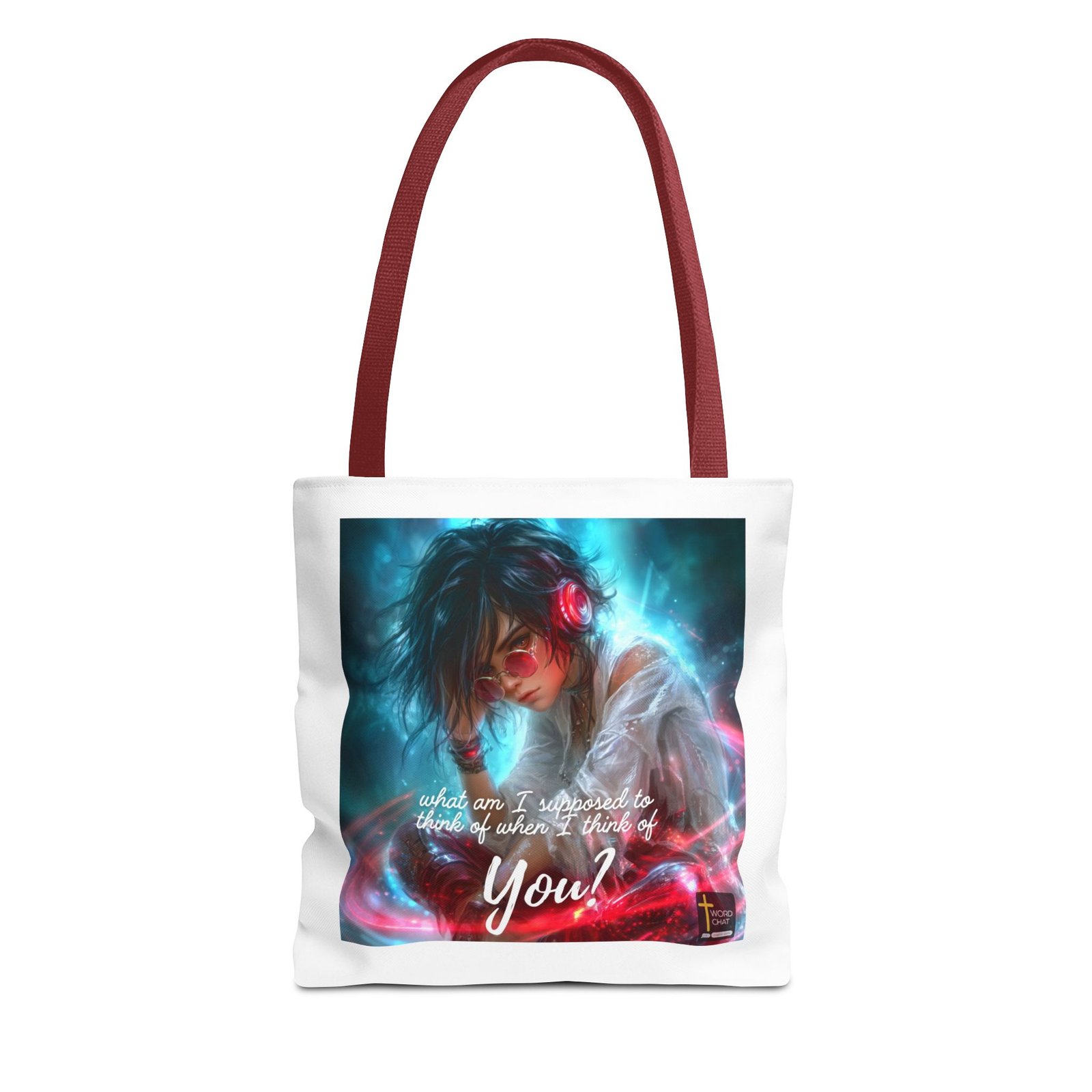 This stunning digital artwork features an ethereal female character with flowing dark hair adorned with glowing red circular accessories and pink-tinted round sunglasses. She wears a shimmering white translucent jacket with intricate details, surrounded by dynamic magical energy in vibrant cyan blue and hot pink hues. The character’s contemplative expression and downward gaze convey introspection, complemented by luminous particle effects and swirling light trails that create a cyberpunk-fantasy aesthetic. Overlaid white cursive text reads “what am I supposed to think of when I think of you?” adding an emotional and philosophical dimension to the composition. The overall style blends anime-inspired character design with modern digital art techniques, featuring dramatic lighting and a moody, atmospheric background with glowing magical elements. The WordChat logo and ‘inspire souls’ tagline sit in the bottom right corner, showing the brand of this platform for finding and sharing soul stirring messages.