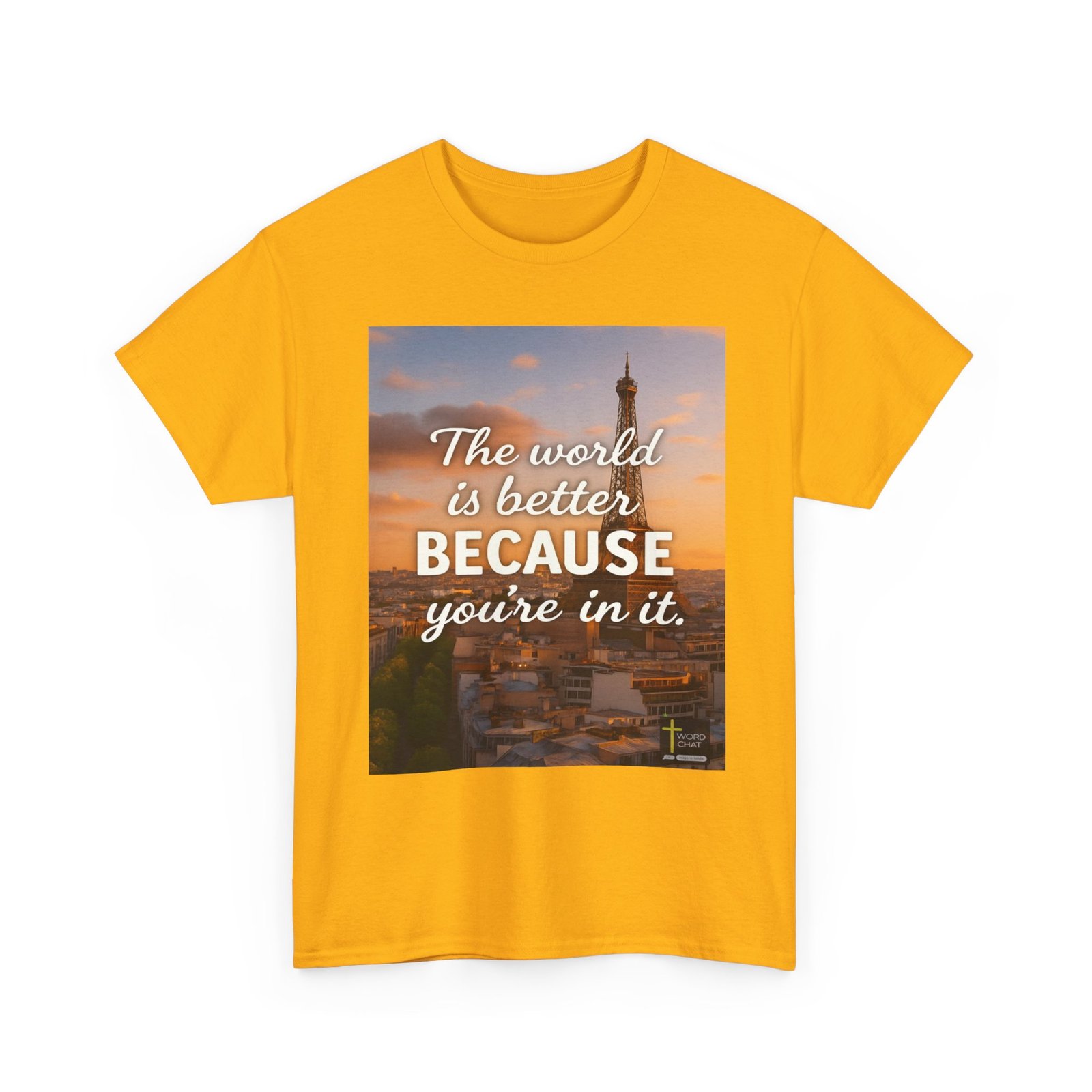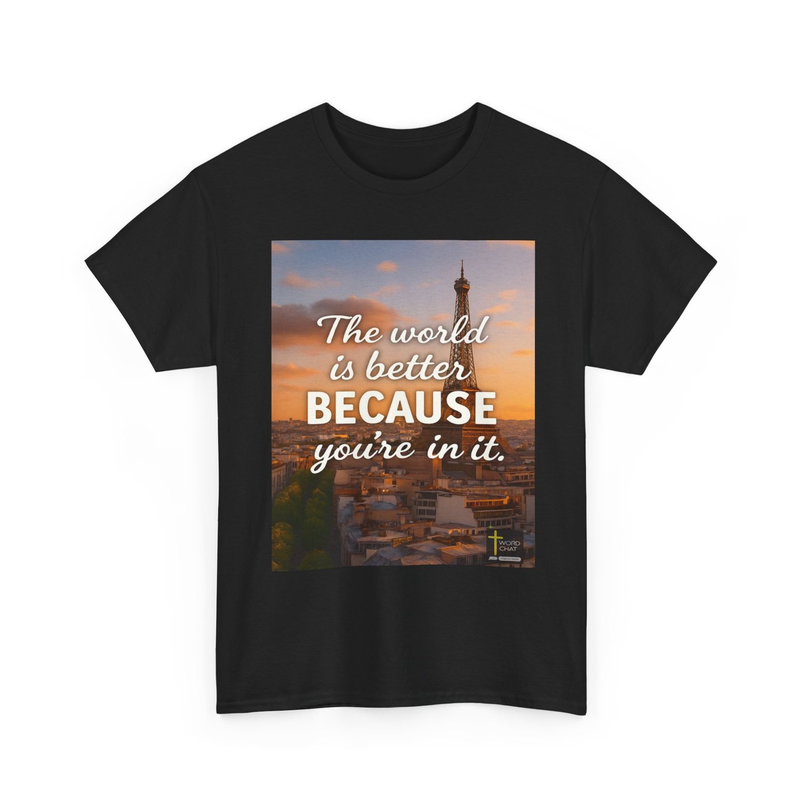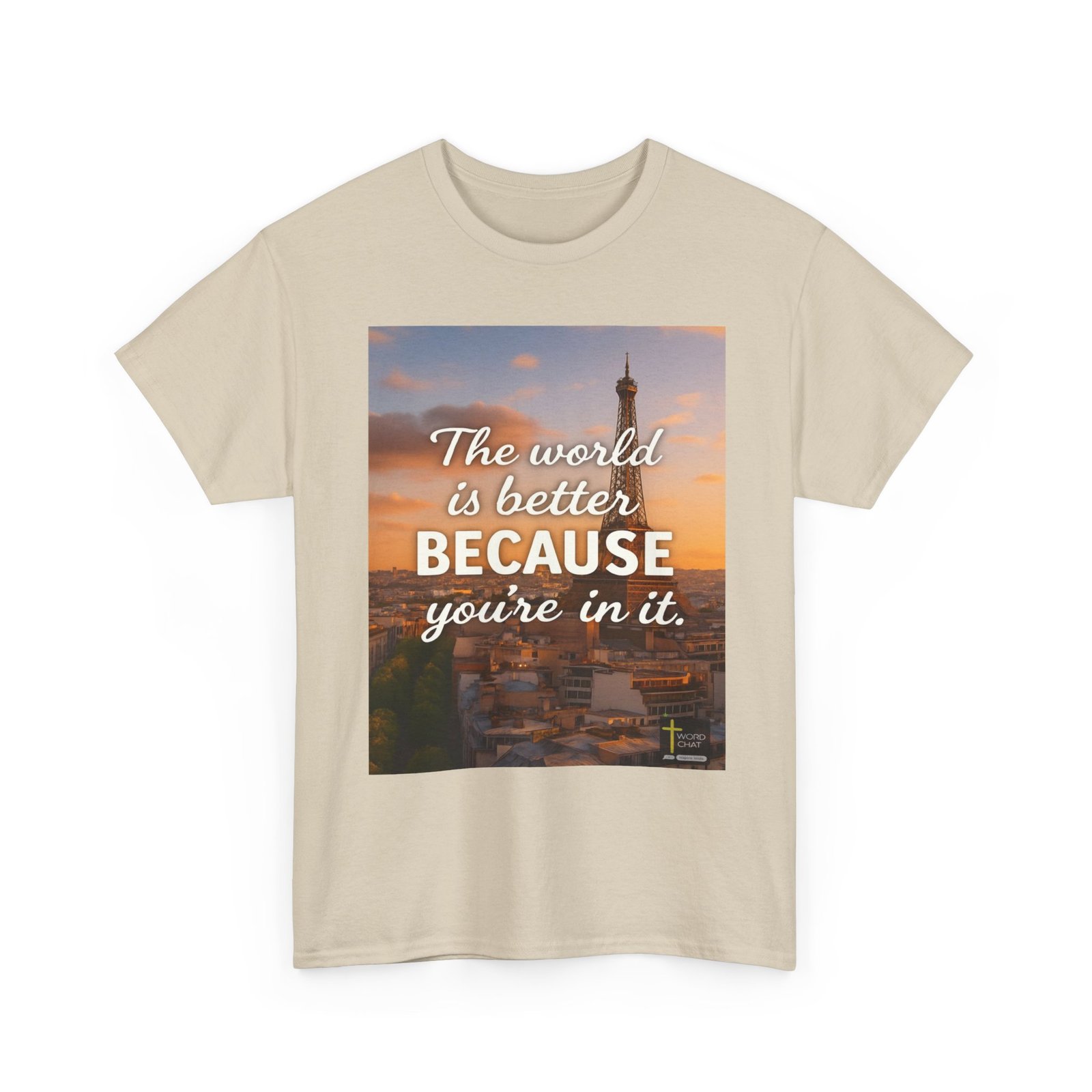 This stunning travel-inspired image features the iconic Eiffel Tower dominating the skyline of Paris during golden hour, with warm sunset hues illuminating the cityscape below. The photograph showcases elegant Parisian architecture and buildings bathed in soft orange and amber light, creating a romantic and dreamy atmosphere. Overlaid on the scenic background is an inspirational quote in white cursive and bold text reading “The world is better BECAUSE you’re in it,” promoting positivity and self-worth. The image employs a motivational quote design style commonly used for social media content, wellness messaging, and spiritual inspiration. A small “WordChat” logo with a cross symbol appears at the bottom, indicating this is faith-based or religious motivational content meant to inspire souls.