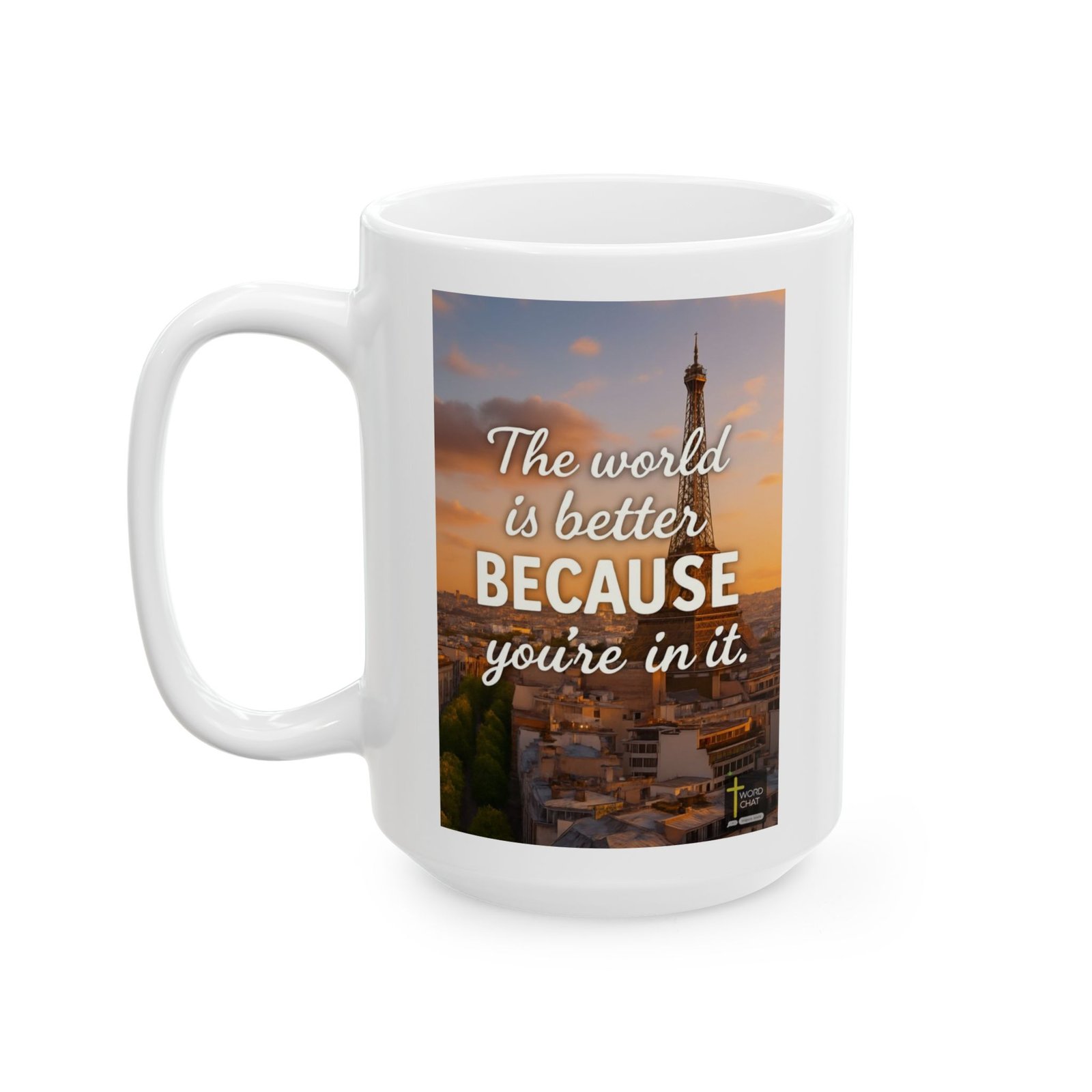 This stunning image features the iconic Eiffel Tower dominating the skyline of Paris, France, photographed during golden hour with warm, glowing light bathing the cityscape. The quote “The world is better BECAUSE you’re in it” is overlaid in elegant white script typography across the center of the composition, delivering an uplifting and motivational message. The background showcases authentic Parisian architecture with historic buildings and tree-lined streets visible below the tower, creating depth and context. The photograph employs a warm color palette of golden, orange, and amber tones enhanced by soft clouds in the sky, giving it a dreamy, aspirational quality perfect for motivational content. This inspirational poster-style image combines travel photography with positive messaging, featuring the Word Chat logo at the bottom.