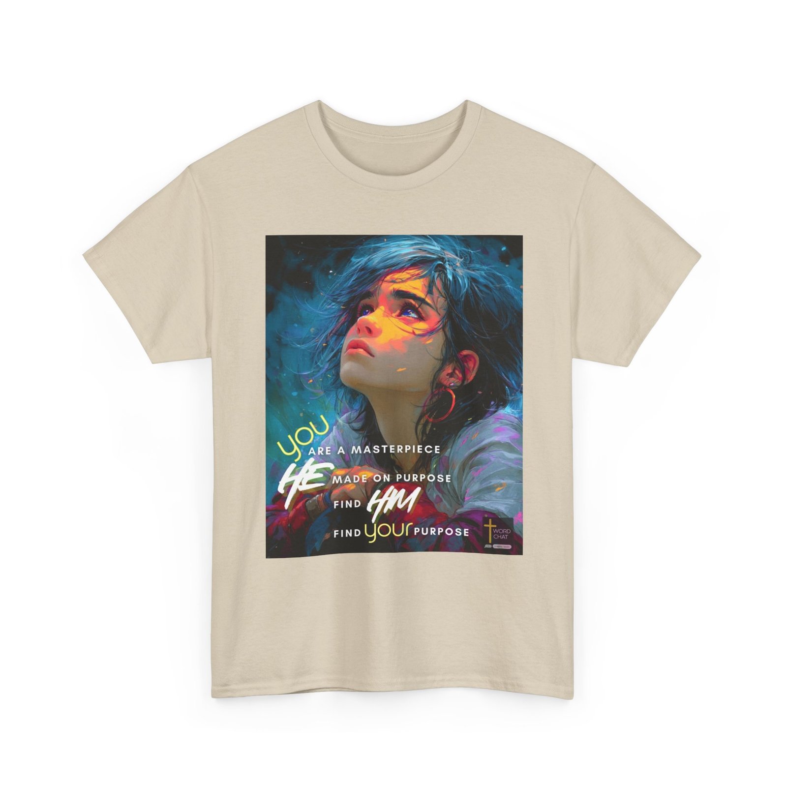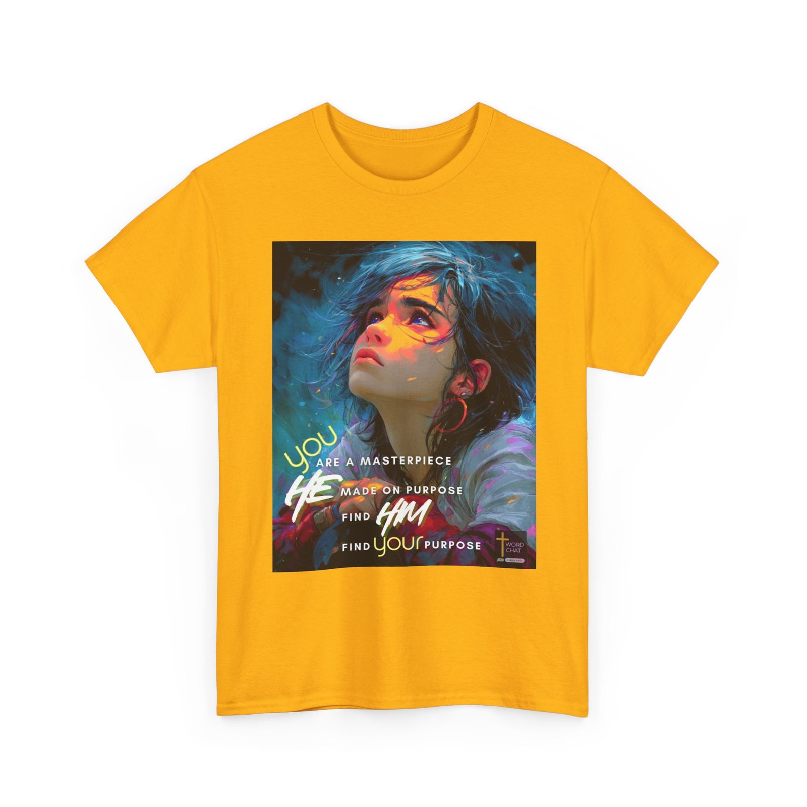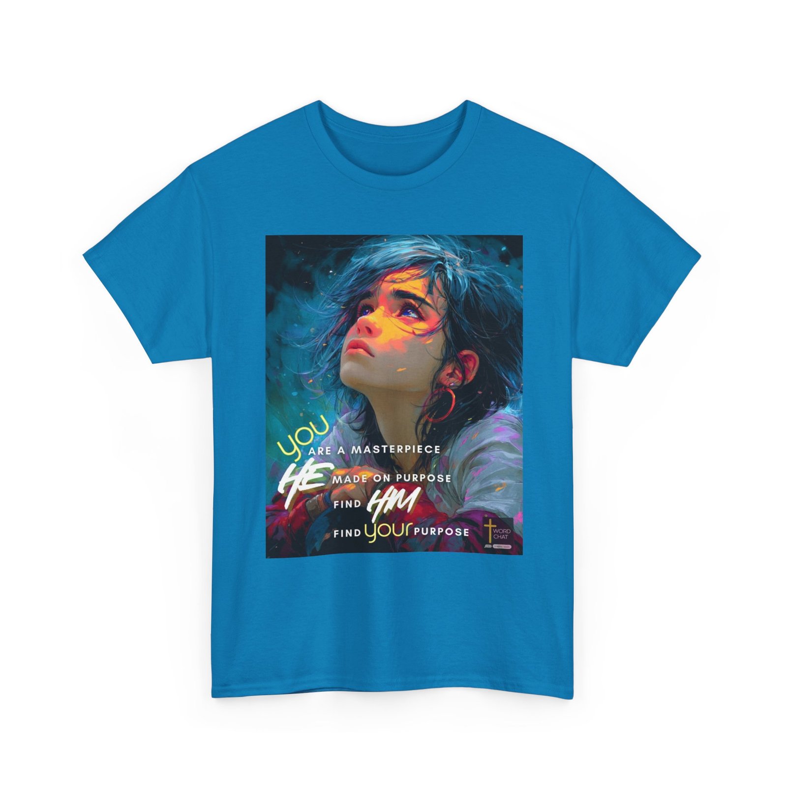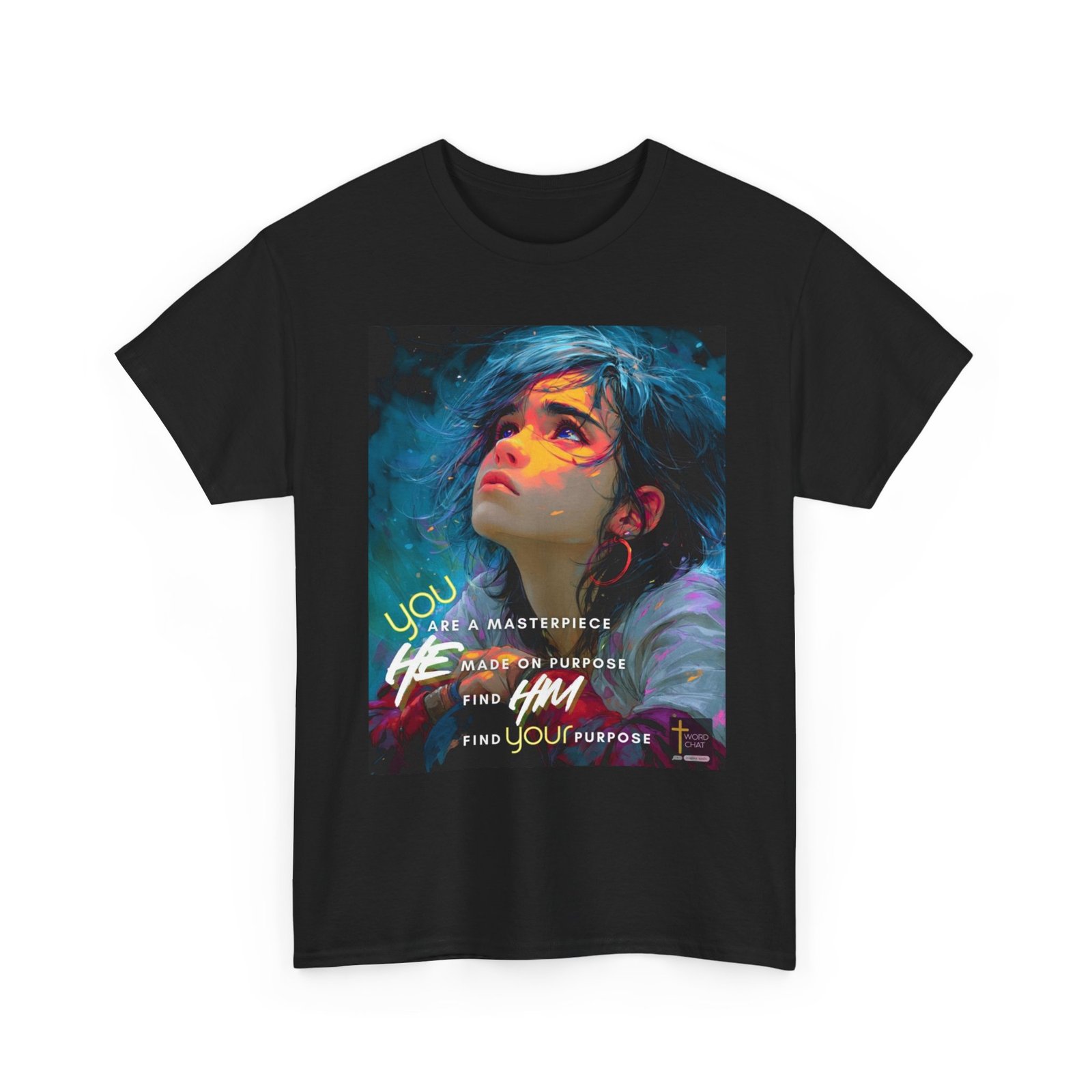 This striking digital artwork features a young person with flowing dark hair and luminous purple eyes, gazing upward against a dynamic teal and blue background. The portrait showcases a modern illustration style with vibrant neon color overlays in pink, yellow, and orange that create an artistic, dreamlike quality across the subject’s face and shoulders. Overlaid text in bold white and yellow lettering reads “You are a masterpiece,” “He made on purpose,” “Find Him,” and “Find your purpose,” delivering an uplifting spiritual message. The composition includes decorative elements such as glowing particles and fluid brushstrokes that enhance the contemporary, motivational aesthetic. A “WordChat” logo with a cross symbol appears in the bottom right corner.