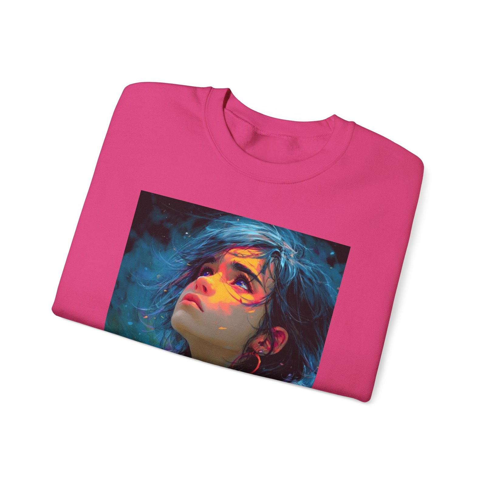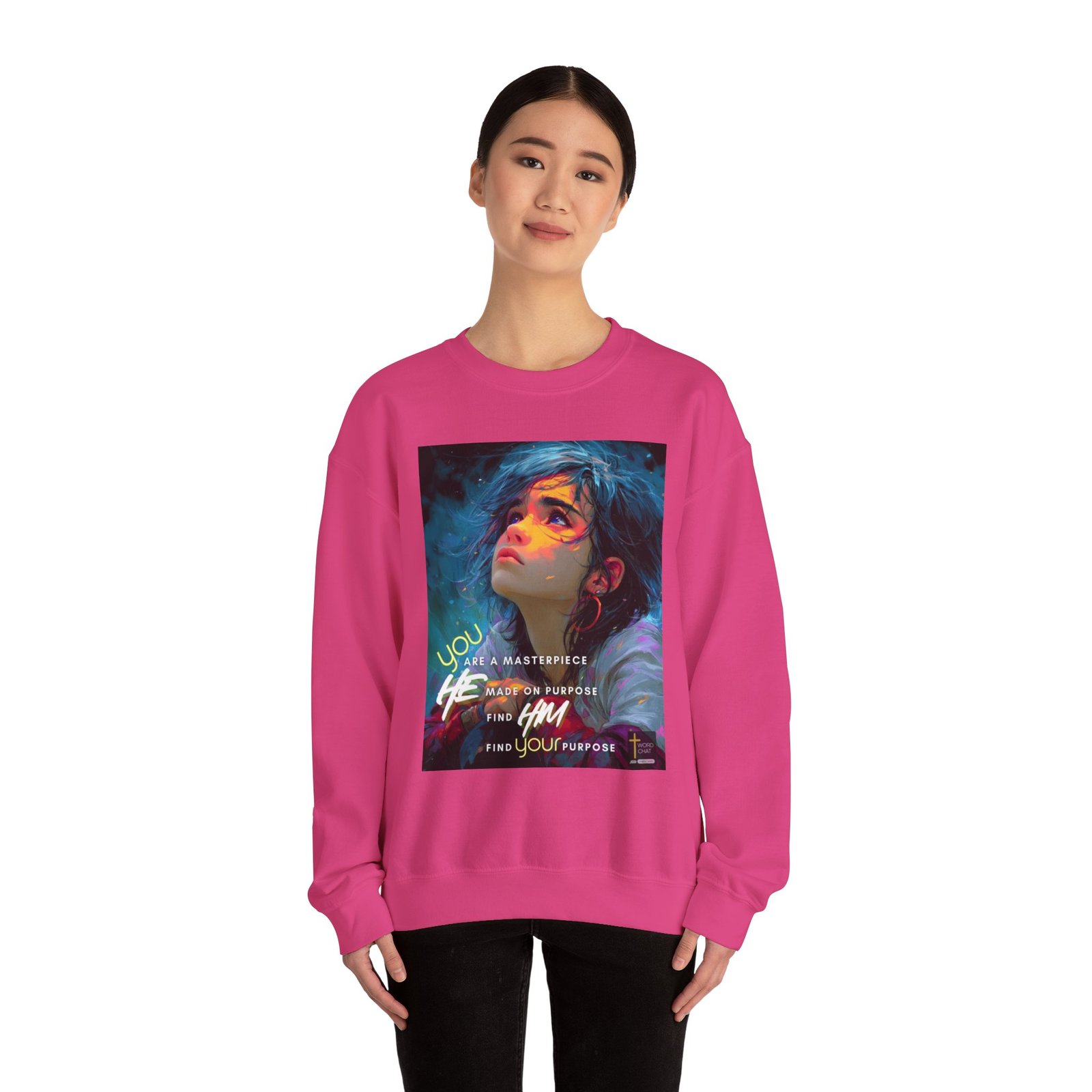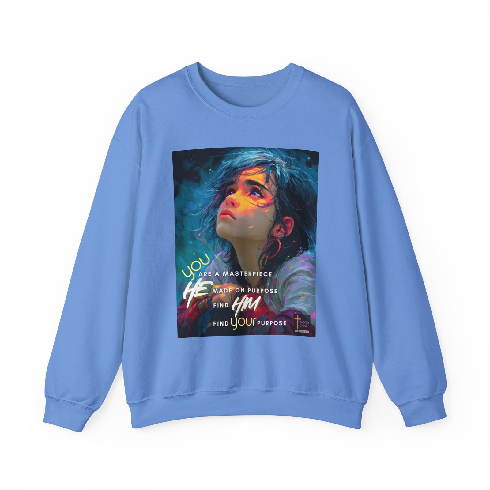 This striking digital artwork features a portrait of a young woman with flowing black hair, her face beautifully illuminated by warm gradient colors including yellows, oranges, pinks, and purples against a cool teal background. The illustration showcases modern digital art style with painterly brushstrokes and ethereal particle effects that create a dynamic, contemporary aesthetic. The composition includes motivational text overlaid on the image reading “You are a masterpiece, He made on purpose, Find Him, Find your purpose,” combined with a cross symbol and “WordChat” branding. Circular red earrings and layered clothing in soft colors add depth to the character design, while the overall color palette contrasts warm facial tones with cool ambient lighting effects. This inspirational graphic serves as a faith-based motivational poster combining spiritual messaging with eye-catching digital illustration techniques.