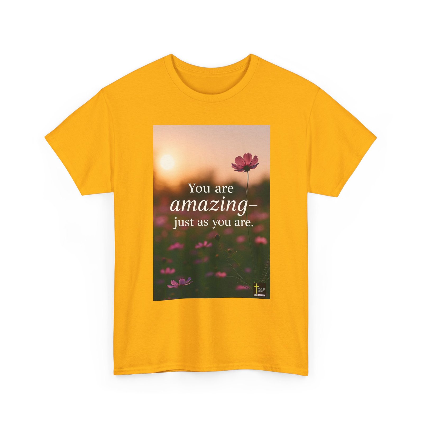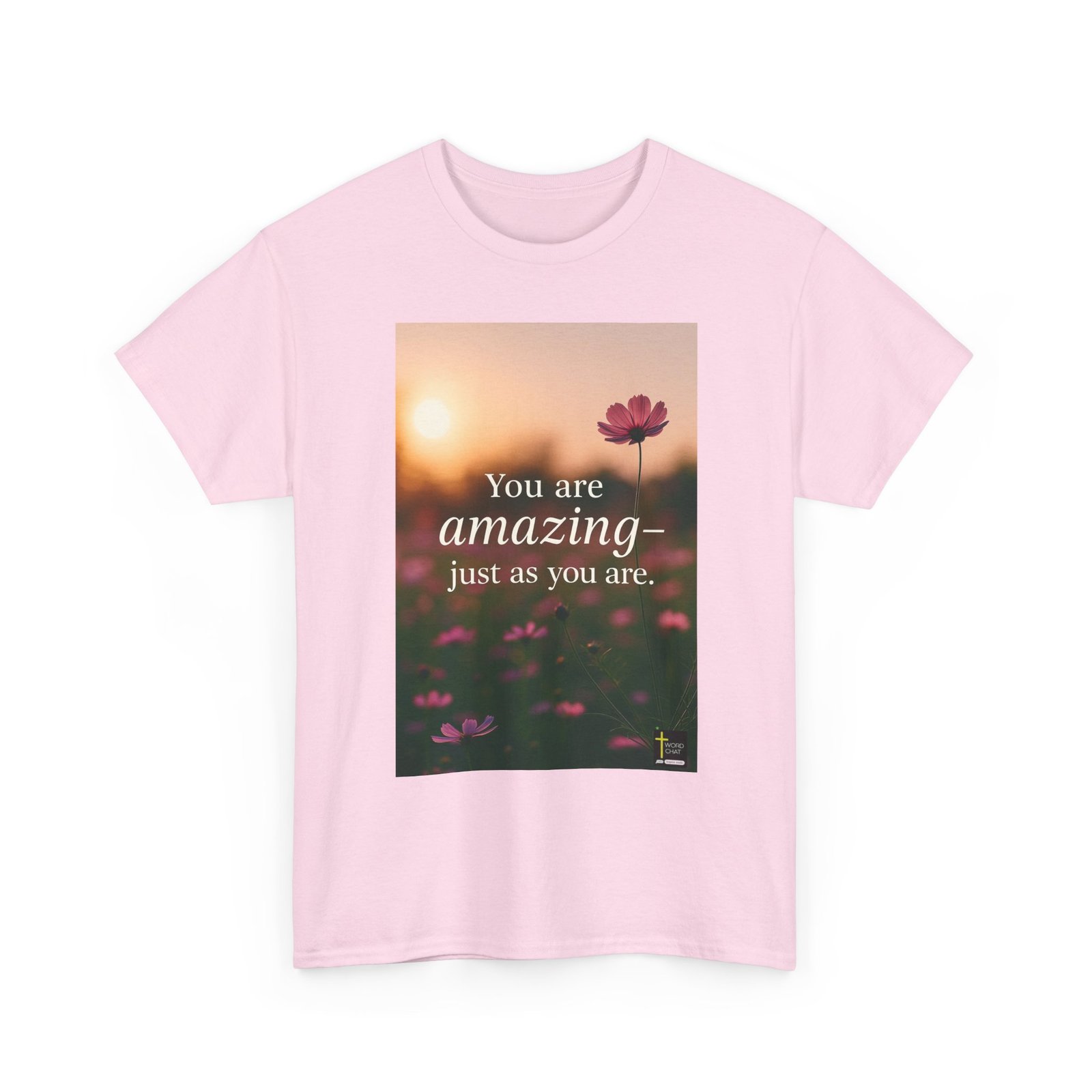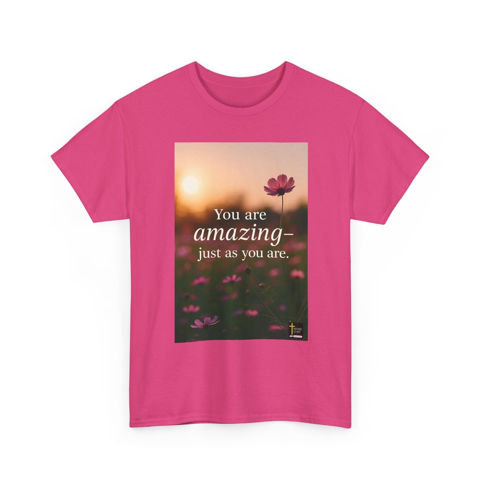 This inspiring image features a delicate pink cosmos flower in the foreground, standing tall against a soft, blurred sunset background with warm golden and green tones. The flower is set against a field of similar pink cosmos blooms, creating a dreamy and serene landscape. Overlaid on the image is an uplifting message in white text that reads “You are amazing—just as you are.” The typography is clean and elegant, positioned centrally to draw the viewer’s attention. A small “WordChat” logo is discretely placed in the bottom right corner of the image, adding a subtle branding element to the motivational visual.