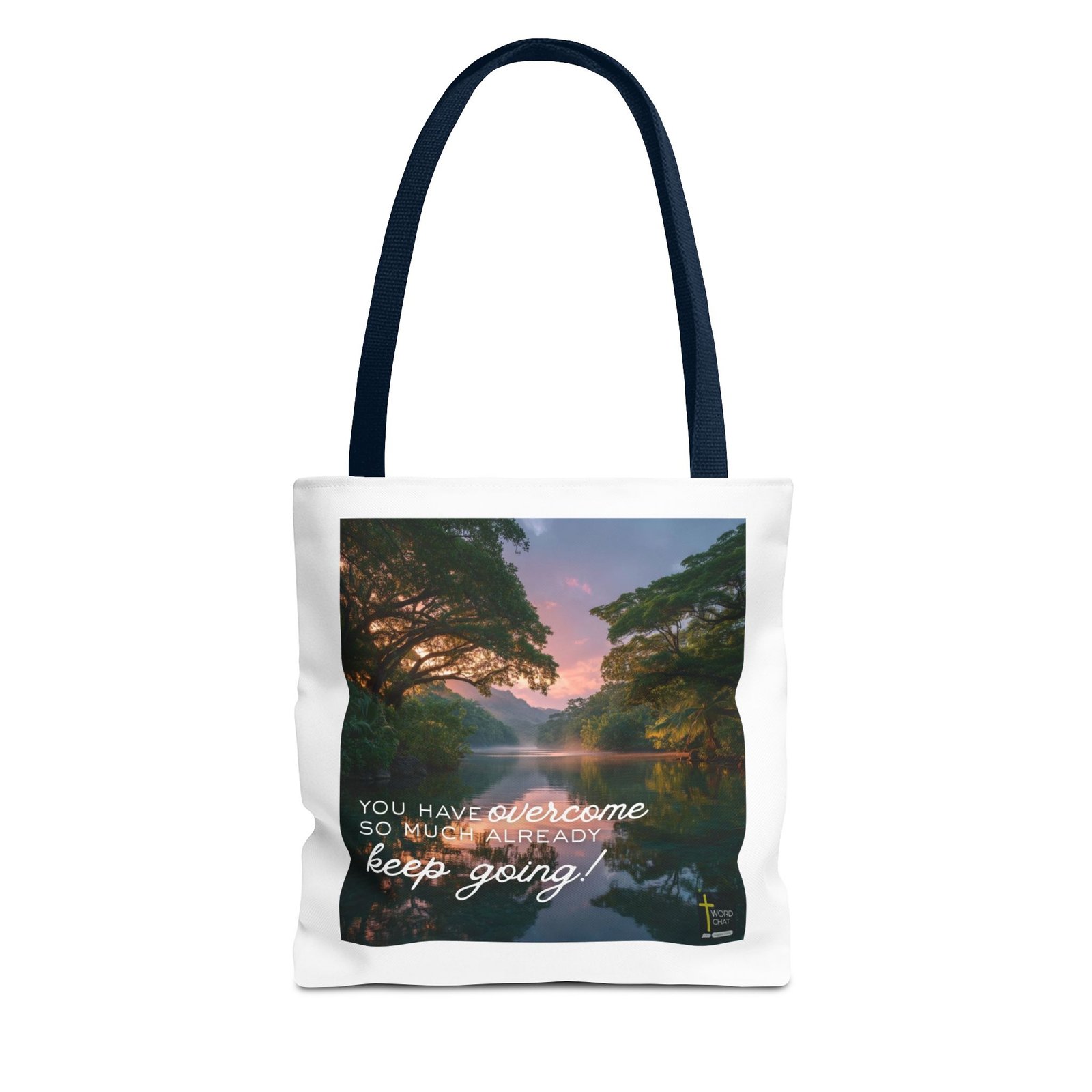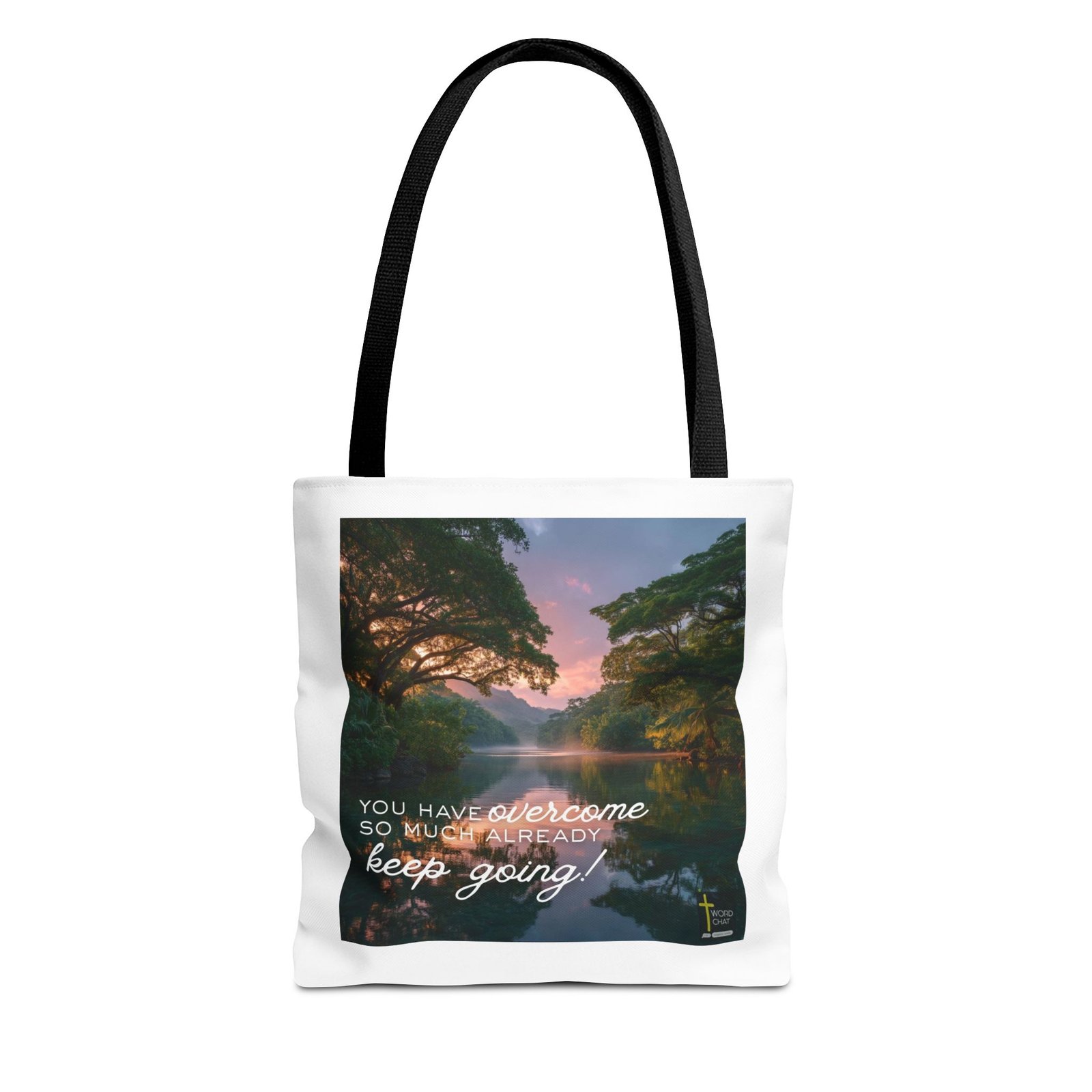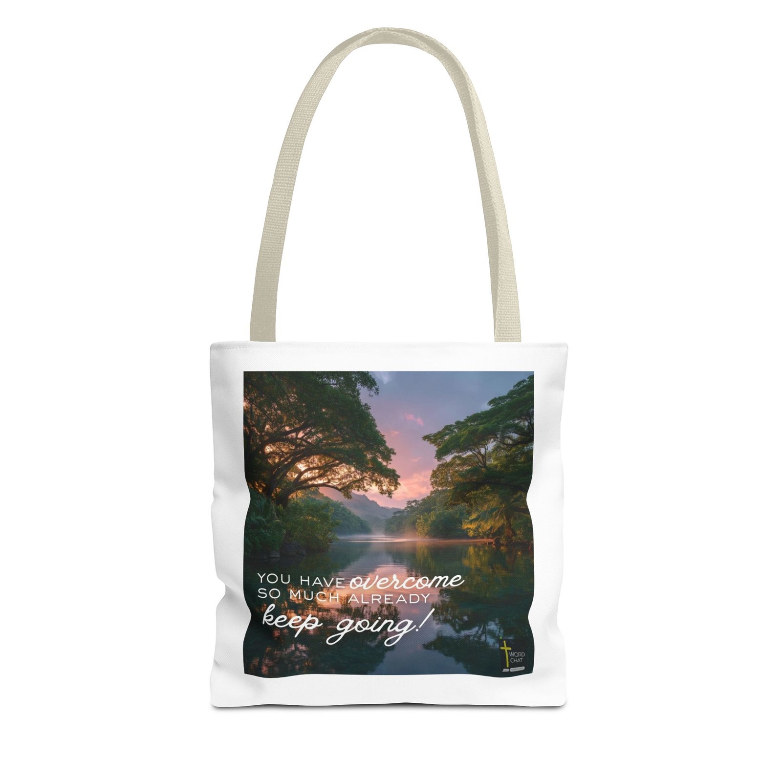This serene landscape image features a tranquil river flowing through a lush tropical valley at golden hour, framed by majestic arching trees with dense green foliage on both banks. The scene captures a stunning sunset with soft pink and purple hues illuminating the sky and reflecting across the calm water’s surface, while mist rises gently from the river and mountains emerge in the misty distance. The composition employs a natural, photographic style with vibrant colors and professional lighting that enhances the peaceful atmosphere and natural beauty of the tropical environment. Overlaid on the image is an inspirational white script and serif text reading “You have overcome so much already keep going!” with a small WordChat logo and cross symbol in the bottom right corner. This motivational image combines breathtaking nature photography with uplifting typography, making it ideal for wellness, spirituality, and personal development content.