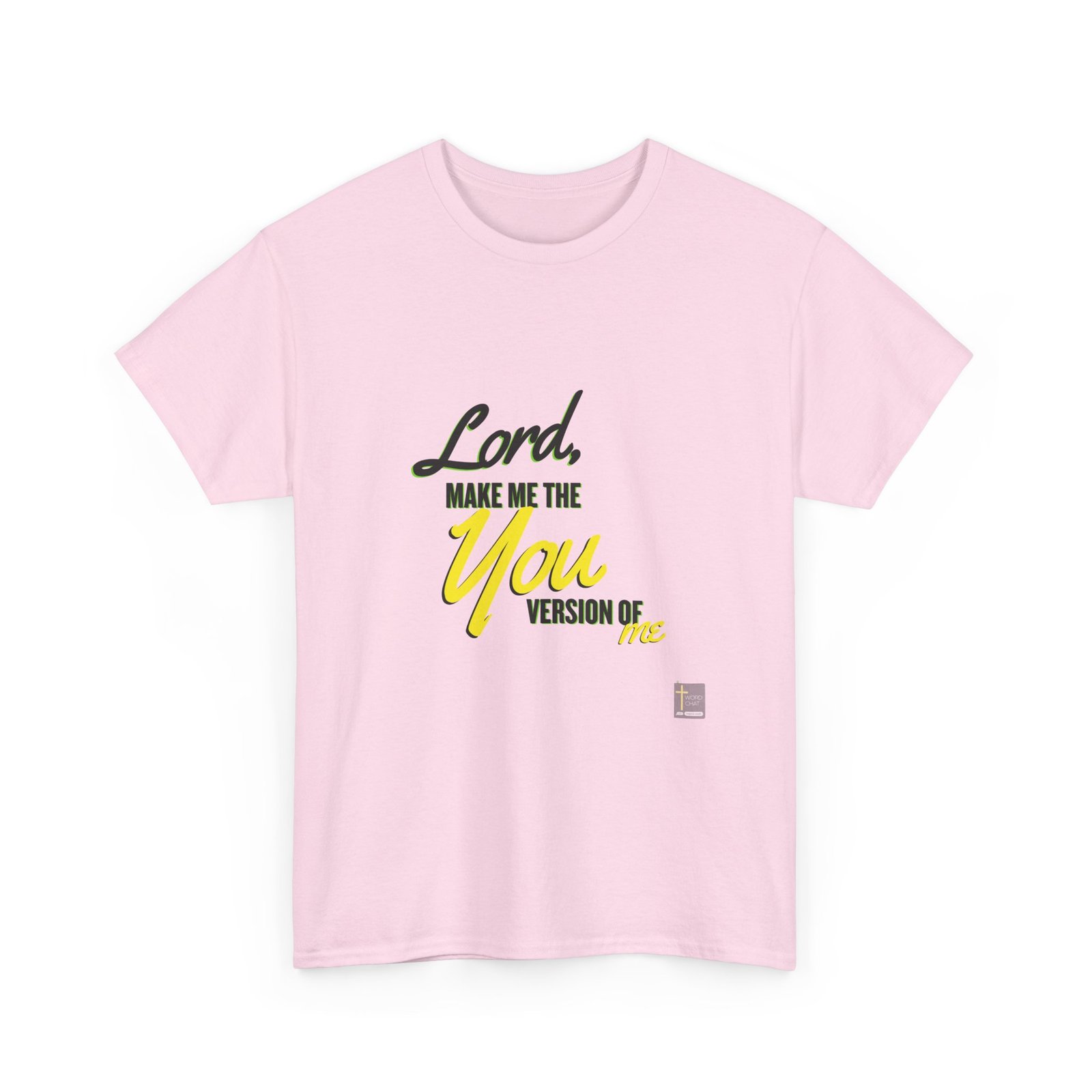 This motivational typographic design features a compelling message composed of multiple text elements arranged vertically. The phrase “Lord, make me the” appears at the top in a stylized cursive script, followed by “VERSION OF” in a bold sans-serif font, with “you” as the focal point in large expressive lettering and “me” completing the sentiment at the bottom right. The composition uses varied font styles and sizes to create visual hierarchy and emphasis throughout the design. A small logo for WordChat appears in the bottom right corner. The overall layout combines artistic typography with a spiritually uplifting message suitable for social media sharing, wall art, or motivational content.