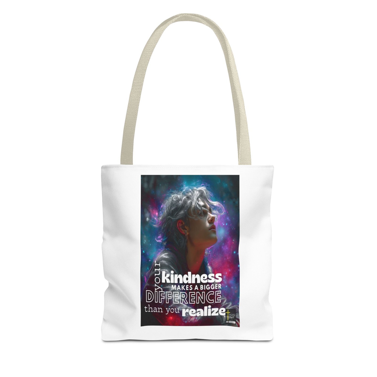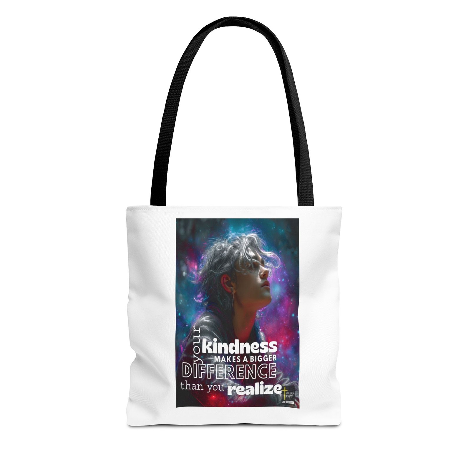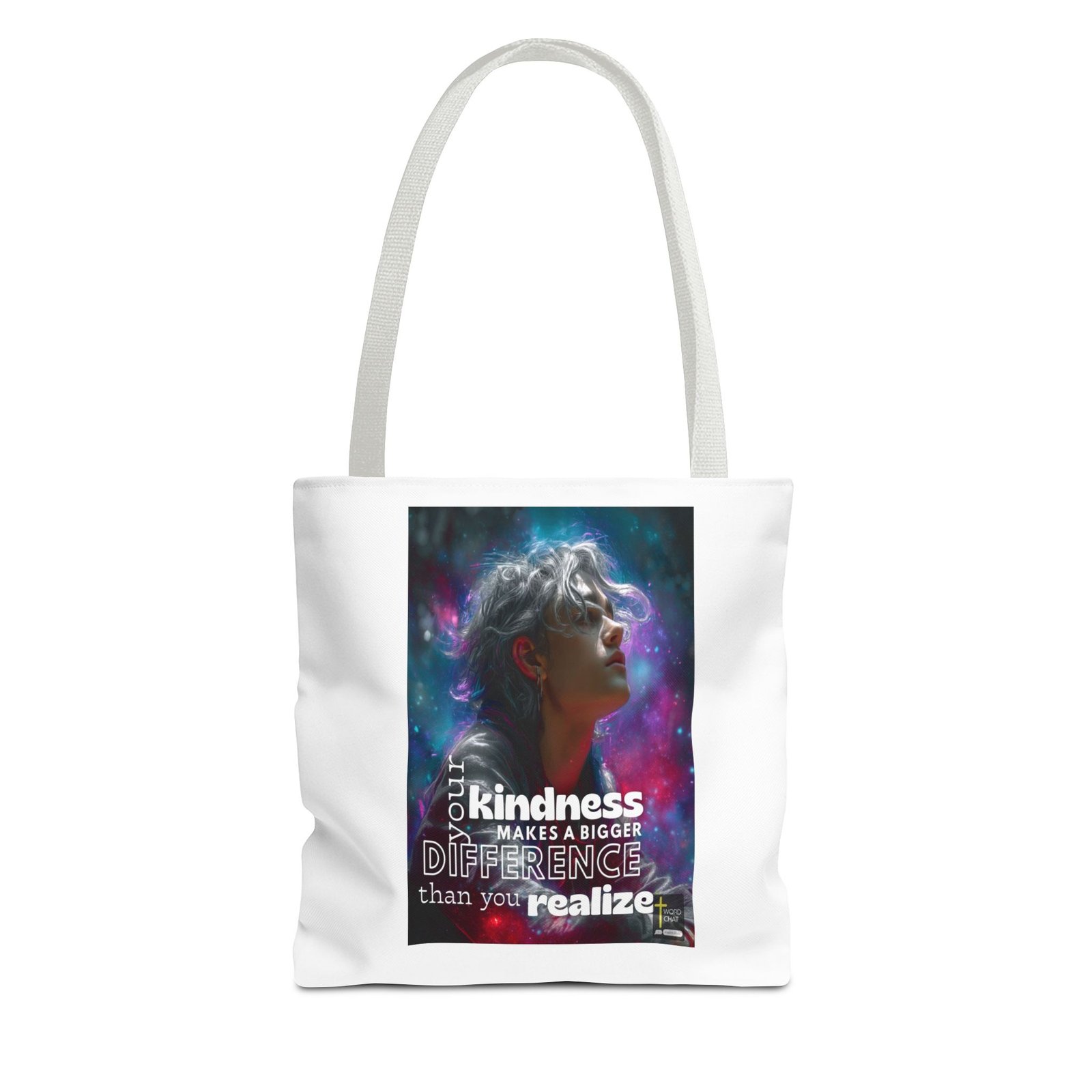 This visually stunning digital artwork features a profile portrait of a person with voluminous silver and gray hair wearing translucent sunglasses, set against a vibrant cosmic background of magenta, teal, and purple swirling energy. The image combines contemporary digital art styling with motivational messaging, displaying the text “Your kindness makes a bigger difference than you realize” in bold white lettering. The figure’s face has a serene, contemplative expression while ethereal light particles and gradient effects swirl around them, creating a dreamlike atmosphere. The portrait style emphasizes modern aesthetics with high-contrast colors and dynamic visual elements that evoke themes of positivity, enlightenment, and personal growth. The design includes branding from “WordChat,” making this ideal for social media inspiration content and wellness-focused marketing materials.