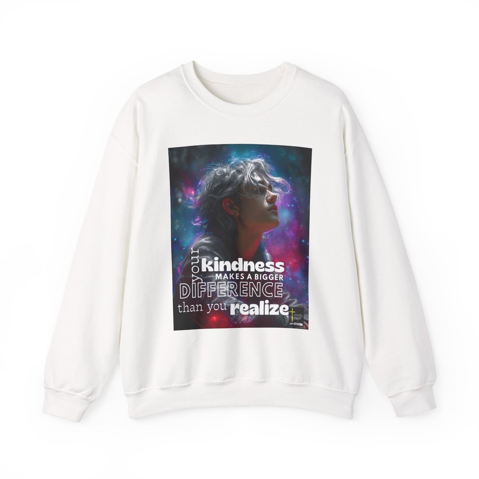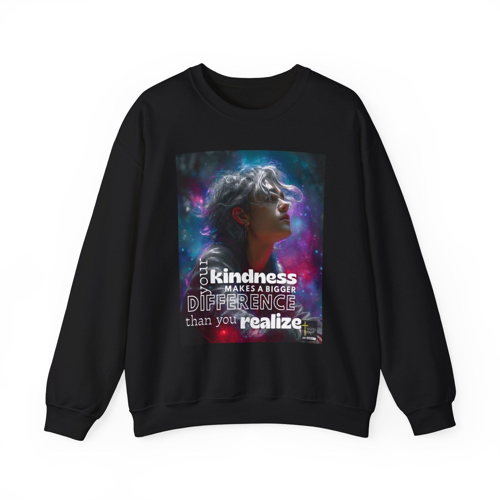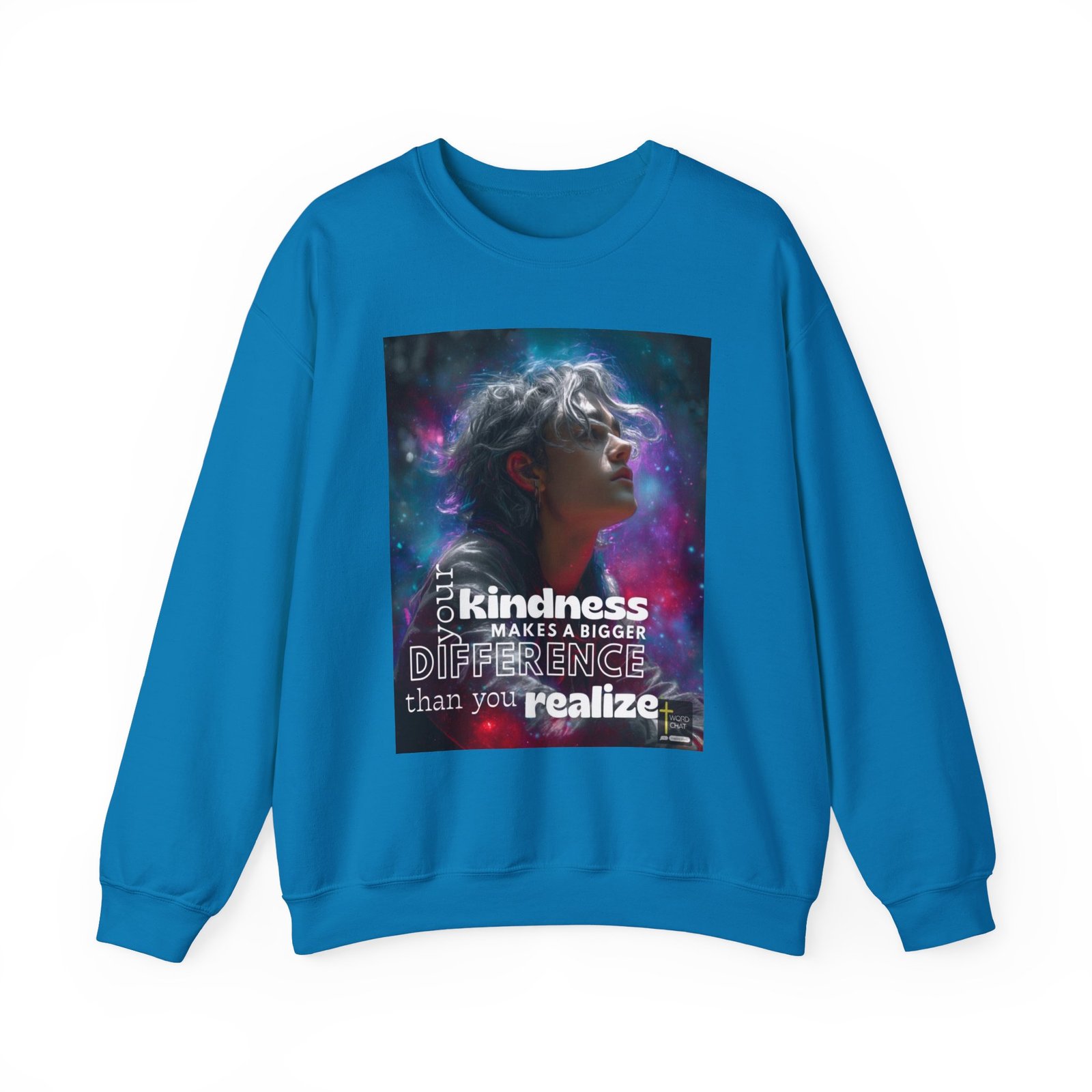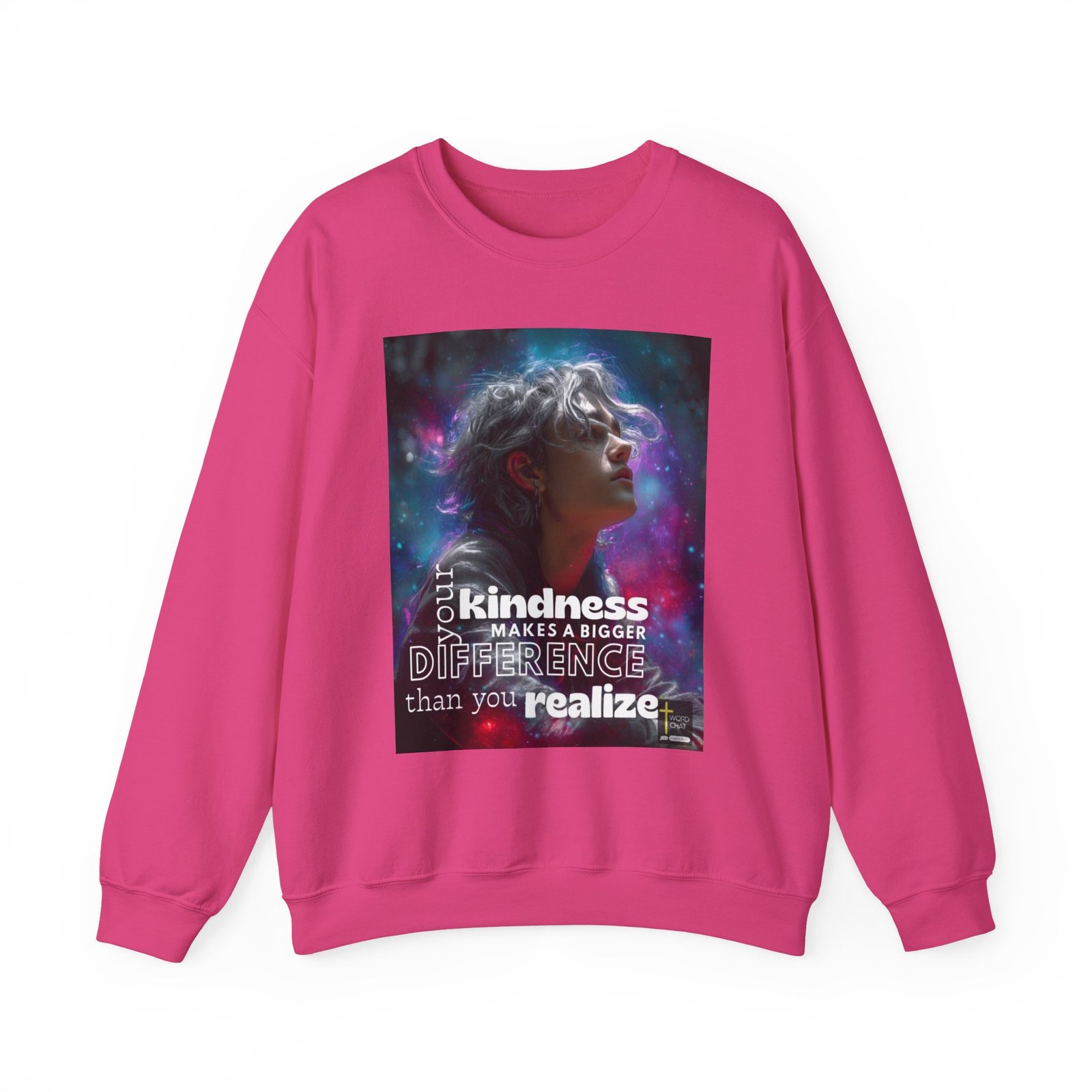 This stunning digital artwork features a profile view of a person with voluminous silver and dark ombre hair, wearing sunglasses and hoop earrings against a vibrant cosmic background. The image is overlaid with the motivational text “Your kindness makes a bigger difference than you realize,” rendered in bold white typography with neon outline effects. The composition is dominated by an ethereal blend of magenta, cyan, and teal colors that swirl around the figure, creating an energetic aura effect with glowing particles and light effects. The modern, high-contrast aesthetic combines portrait illustration with digital design elements, evoking a contemporary, inspirational poster style perfect for motivational content. The overall visual impact emphasizes themes of empowerment and positivity through its striking color palette and uplifting message. The WordChat logo and ‘inspire souls’ tagline sit in the bottom right corner.