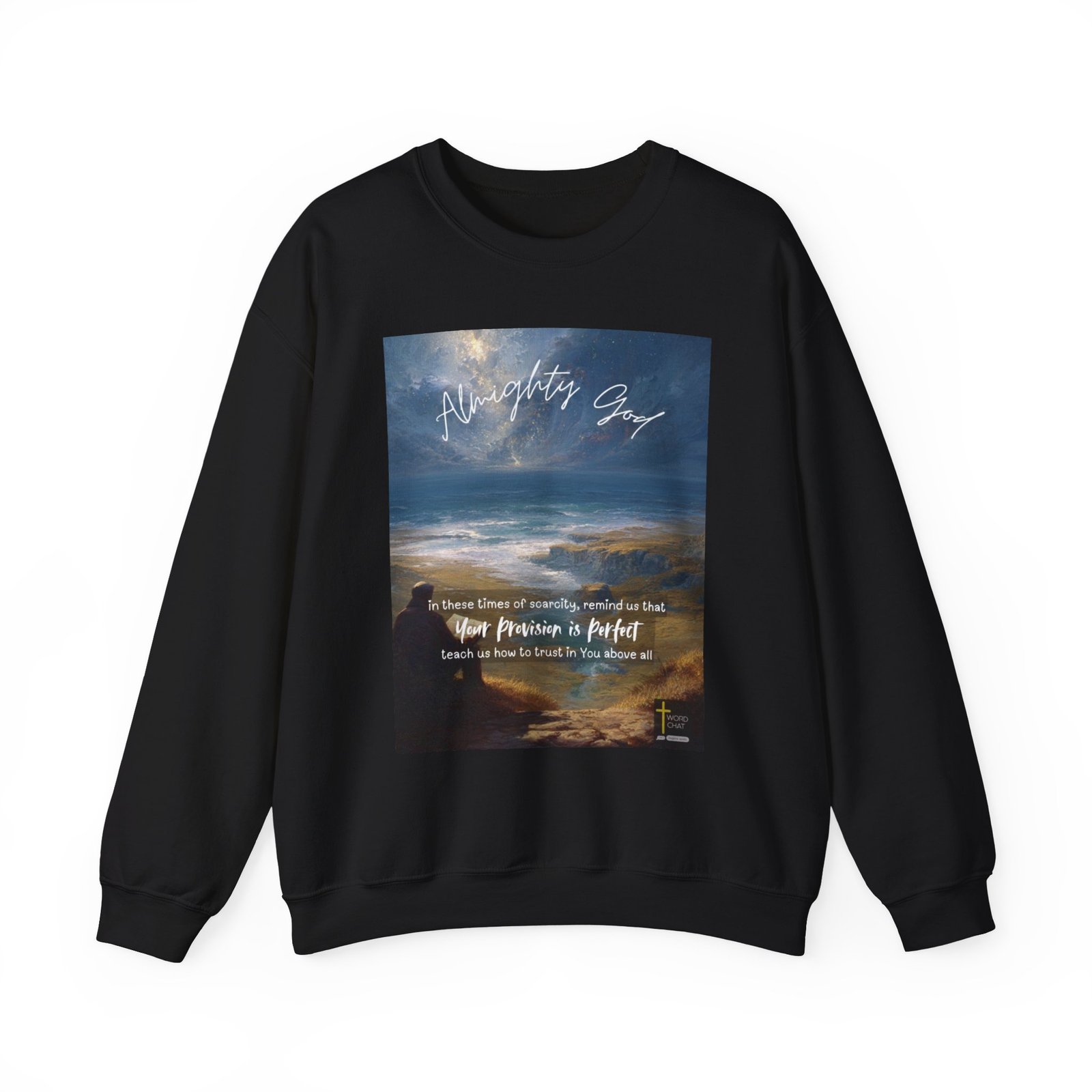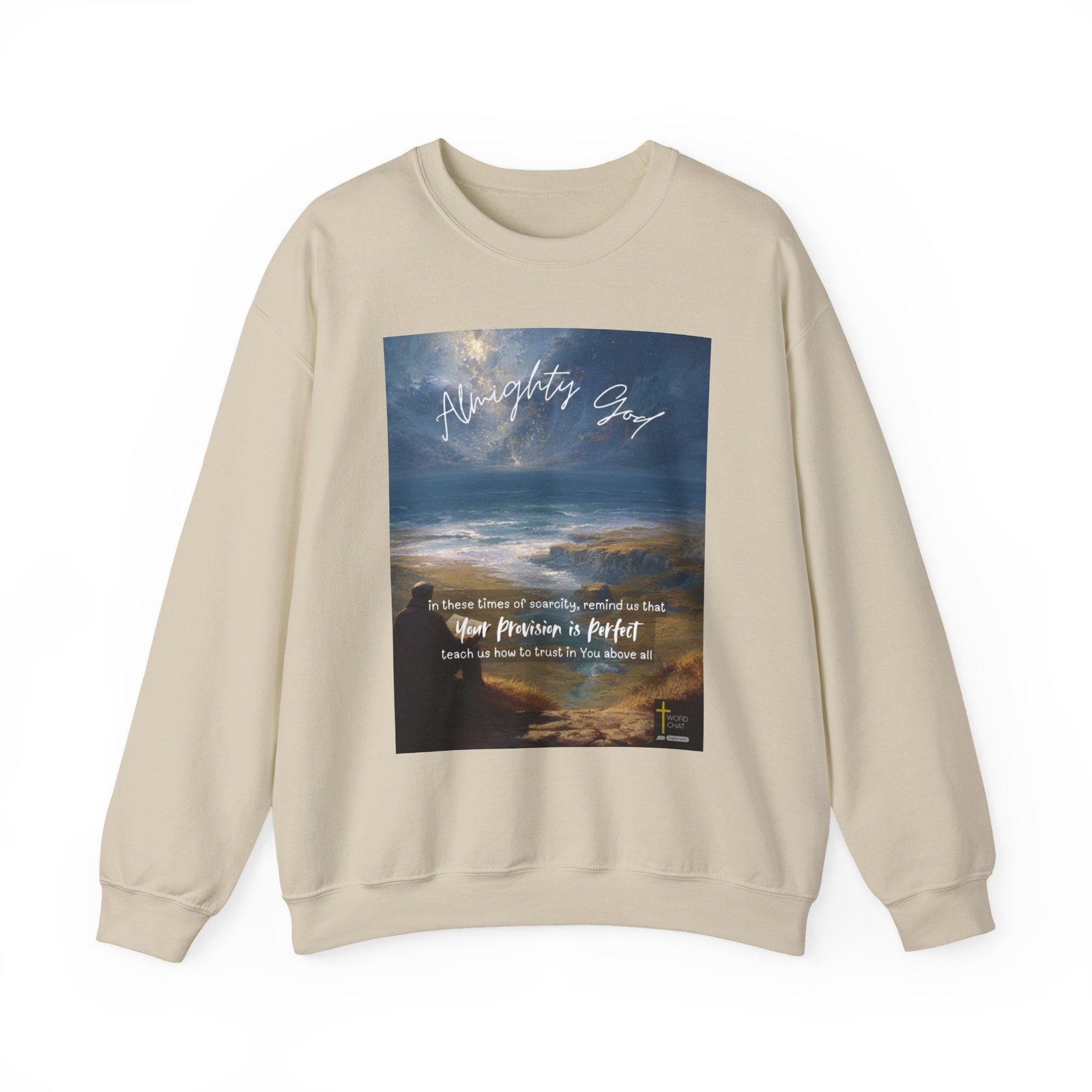This inspirational religious image features a serene coastal landscape with a solitary figure seated on golden grassland overlooking dramatic ocean waves and rocky cliffs beneath a luminous, cloud-filled sky. The composition includes elegant white script text reading “Almighty God” at the top and a faith-based message stating “in these times of scarcity, remind us that Your provision is Perfect” and “teach us how to trust in You above all” overlaid on the scenic background. The artistic style blends digital painting techniques with photorealistic elements, creating a contemplative and spiritual aesthetic with warm golden tones contrasting against cool blue ocean hues. A small “WordChat” logo with a cross symbol and “inspire souls” tagline appears in the lower right corner. The image serves as a devotional or motivational graphic, combining peaceful nature imagery with Christian faith messaging to inspire trust and spiritual reflection during challenging times.