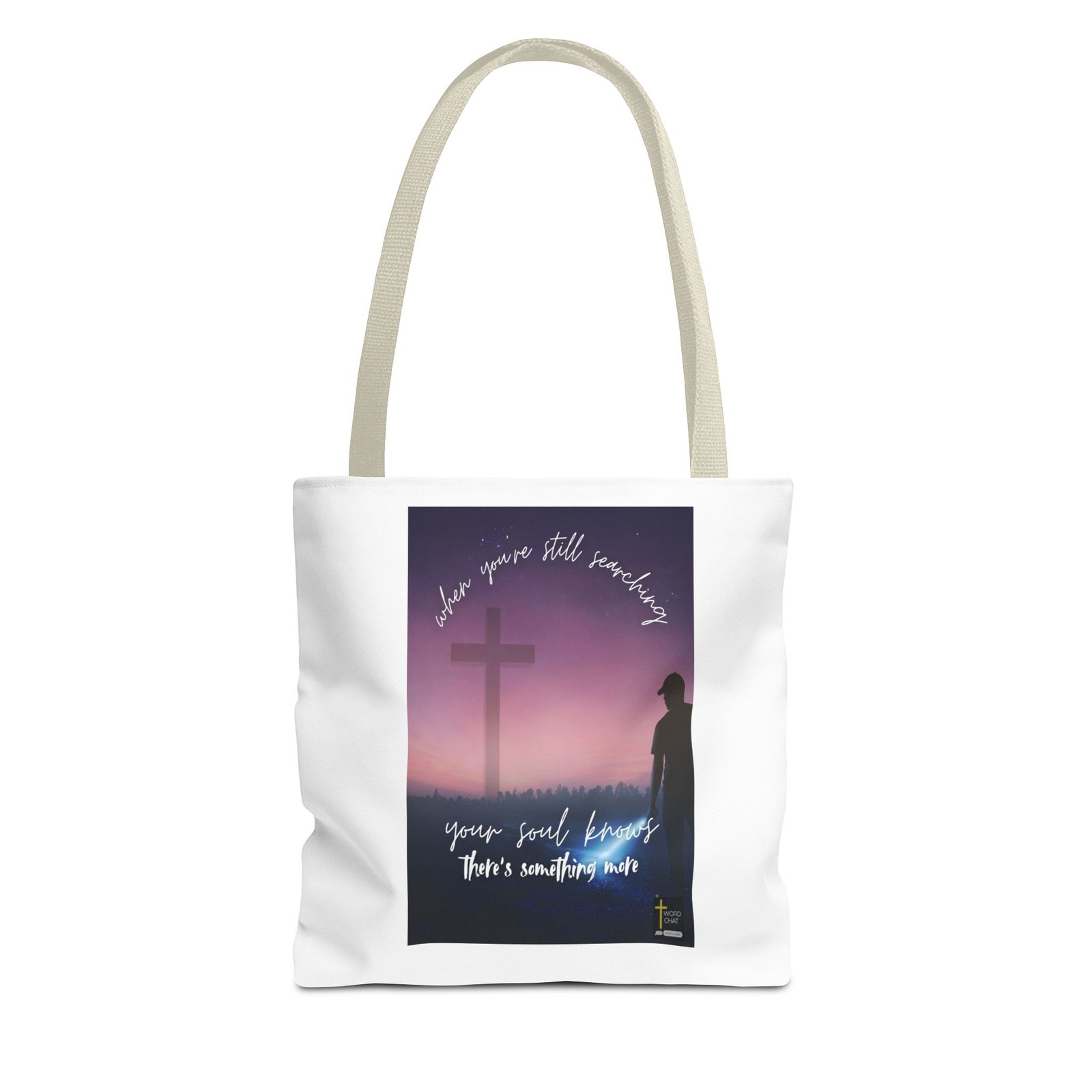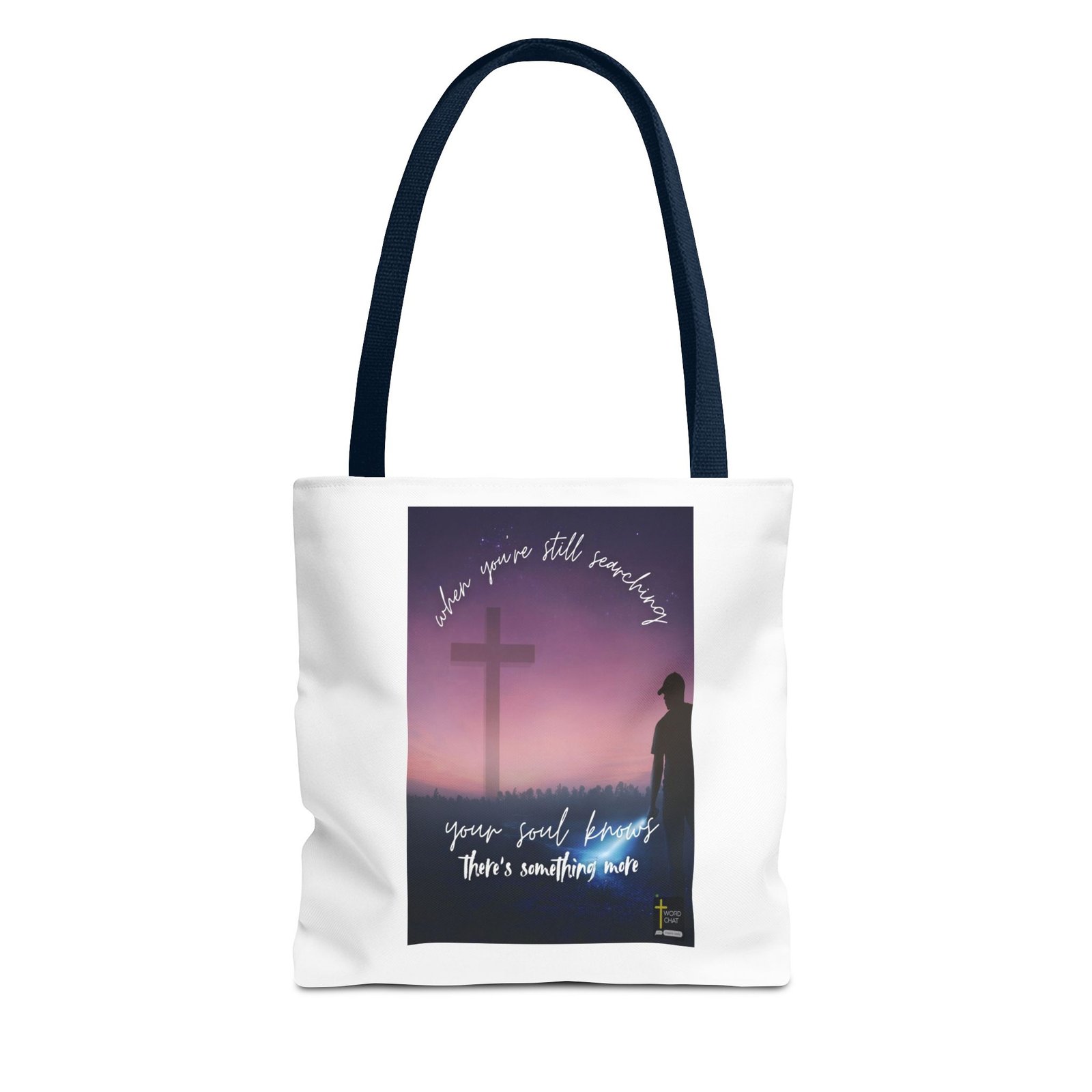 This inspirational digital artwork features a silhouetted figure standing in a misty landscape, gazing toward a large illuminated cross set against a twilight sky filled with stars. The image employs a dreamlike aesthetic with purple and pink gradient tones that create a serene, contemplative atmosphere. Overlaid in elegant white cursive text, the message reads “When you’re still searching, your soul knows there’s something more,” conveying themes of spiritual awakening and faith. The composition includes a glowing light source near the figure’s feet, adding mystical depth and drawing the viewer’s eye toward the cross. A “WordChat” logo with a yellow cross appears in the bottom right corner, identifying this as inspirational content designed to uplift and encourage spiritual reflection.