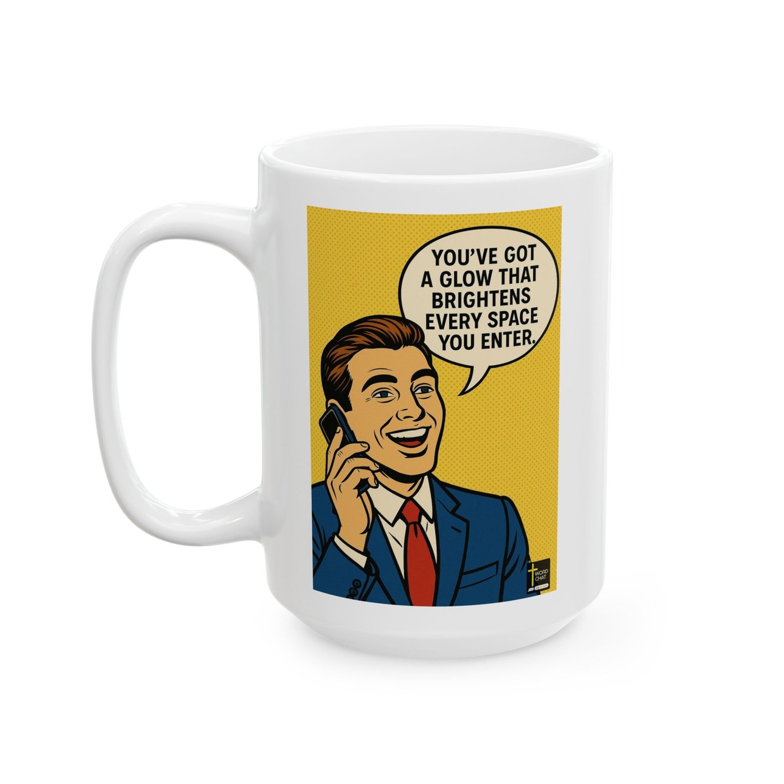 This vintage-style pop art illustration features a cheerful businessman in a blue suit and red tie talking on a phone. The image is set against a yellow background with a halftone dot pattern, creating a retro 1950s or 1960s aesthetic. The figure is drawn in a bold, graphic style with clean lines and flat colors, typical of mid-century commercial illustration. A speech bubble contains the text “YOU’VE GOT A GLOW THAT BRIGHTENS EVERY SPACE YOU ENTER.” In the bottom right corner, there’s a small “Word Chat” logo, suggesting this is part of a marketing or communication-themed design.
